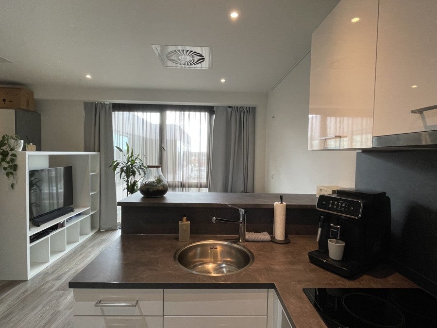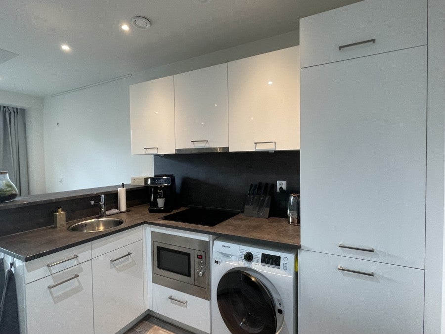 Als je binnenkomt heb je een hoekkeuken met afzuigkap, inductie kookplaat, combi-magnetron, koelkast en vriezer. Onder het aanrechtblad is ook een aansluiting en afvoer voor een wasmachine gemaakt.