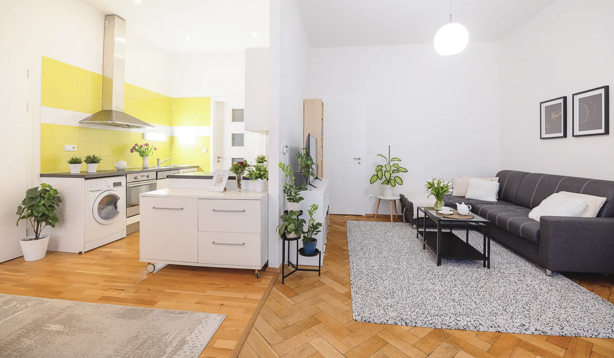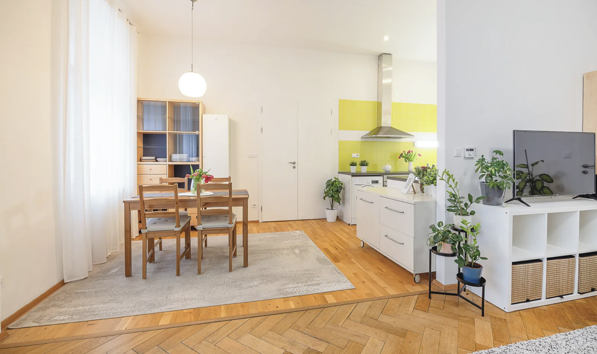 De indeling is zeer goed doordacht en geeft een luchtige, aangename indruk. Het meest opvallende element van het appartement is de woonkamer met kitchenette van 14,9 m², die naadloos aansluit op de hoofdleefruimte van 22,0 m².