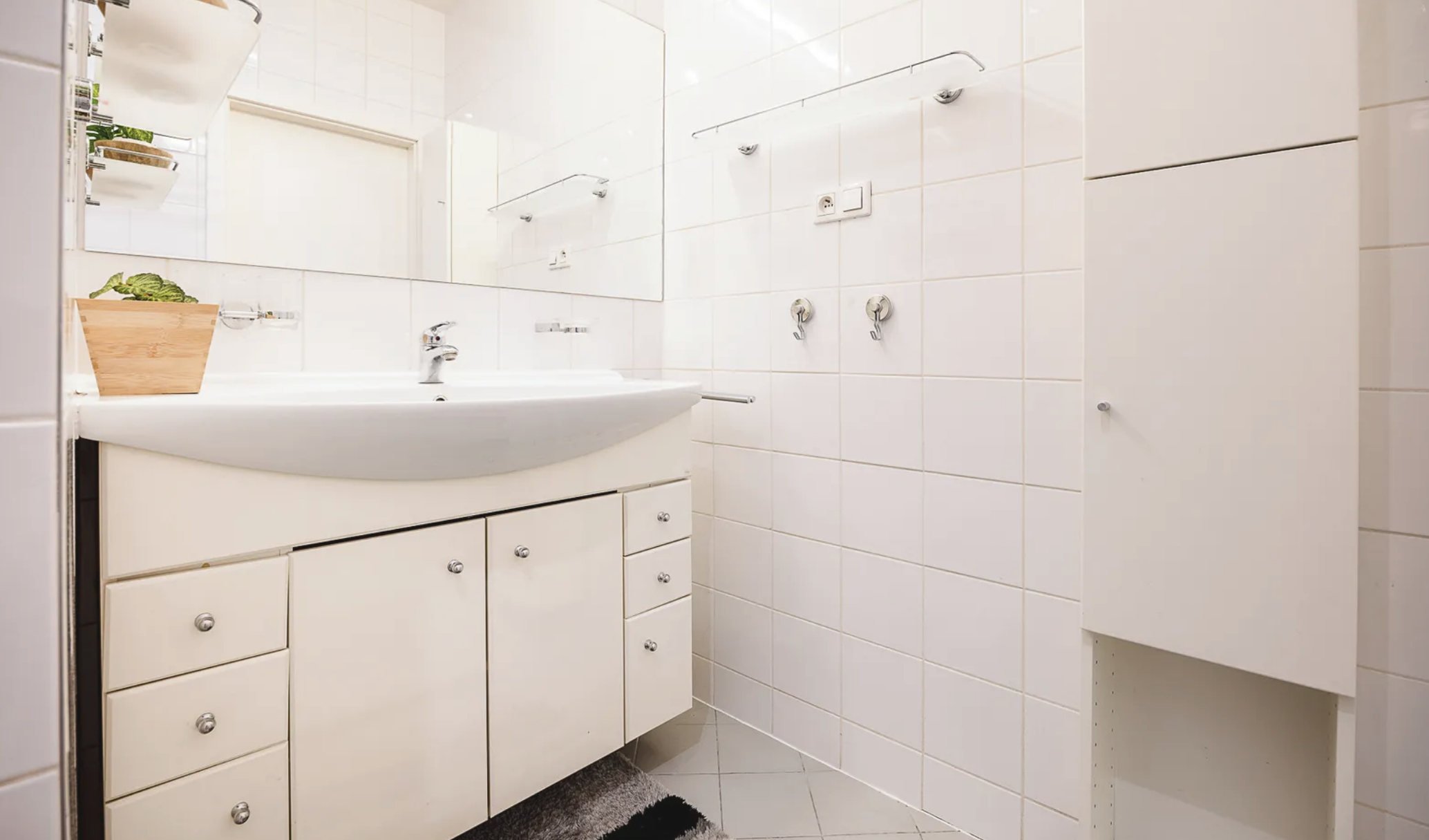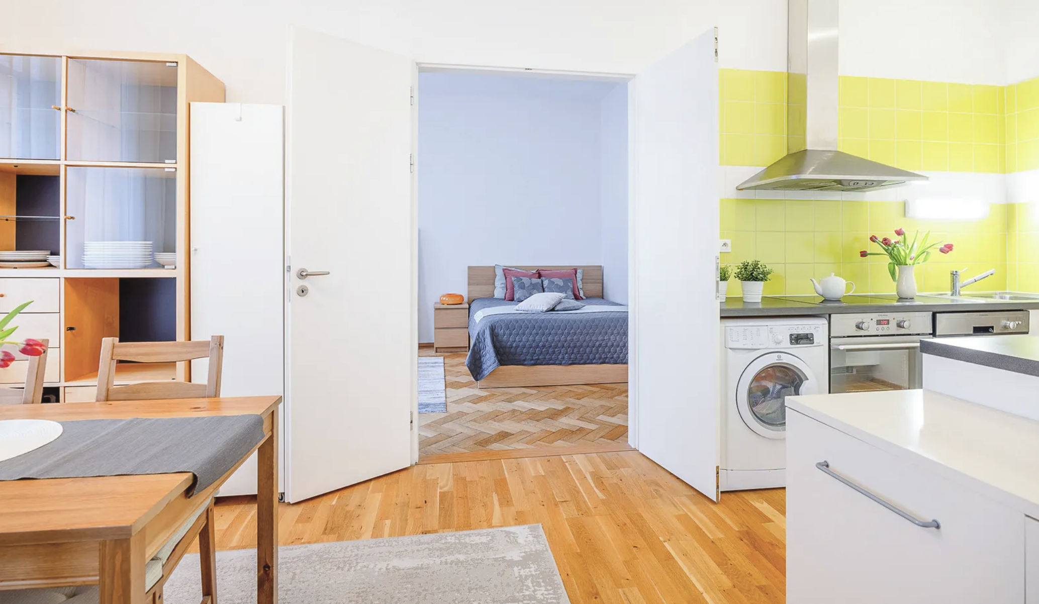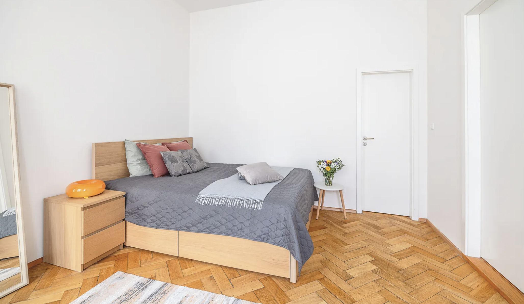 De tweede kamer van 21,2 m² dient als slaapkamer en beschikt over een aparte kledingkast, wat het wooncomfort aanzienlijk verhoogt en voldoende opbergruimte biedt zonder dat er extra opbergmeubels nodig zijn.