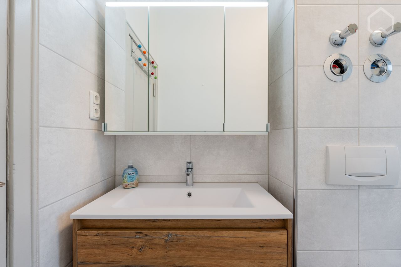 - Elegante en praktische badkamer: deze kamer heeft een moderne douchecabine, omgeven door transparant glas en met een luxe regendouche..