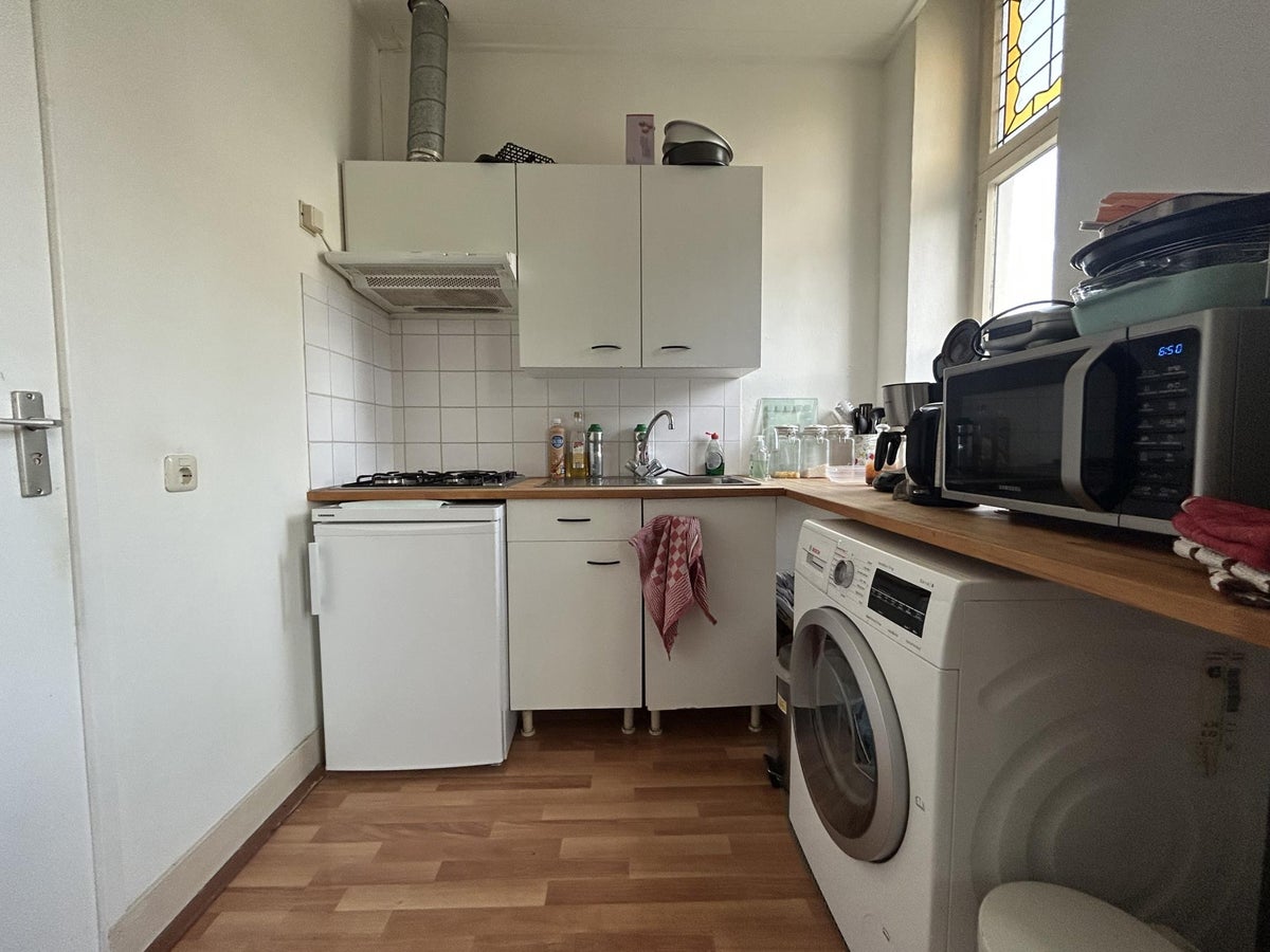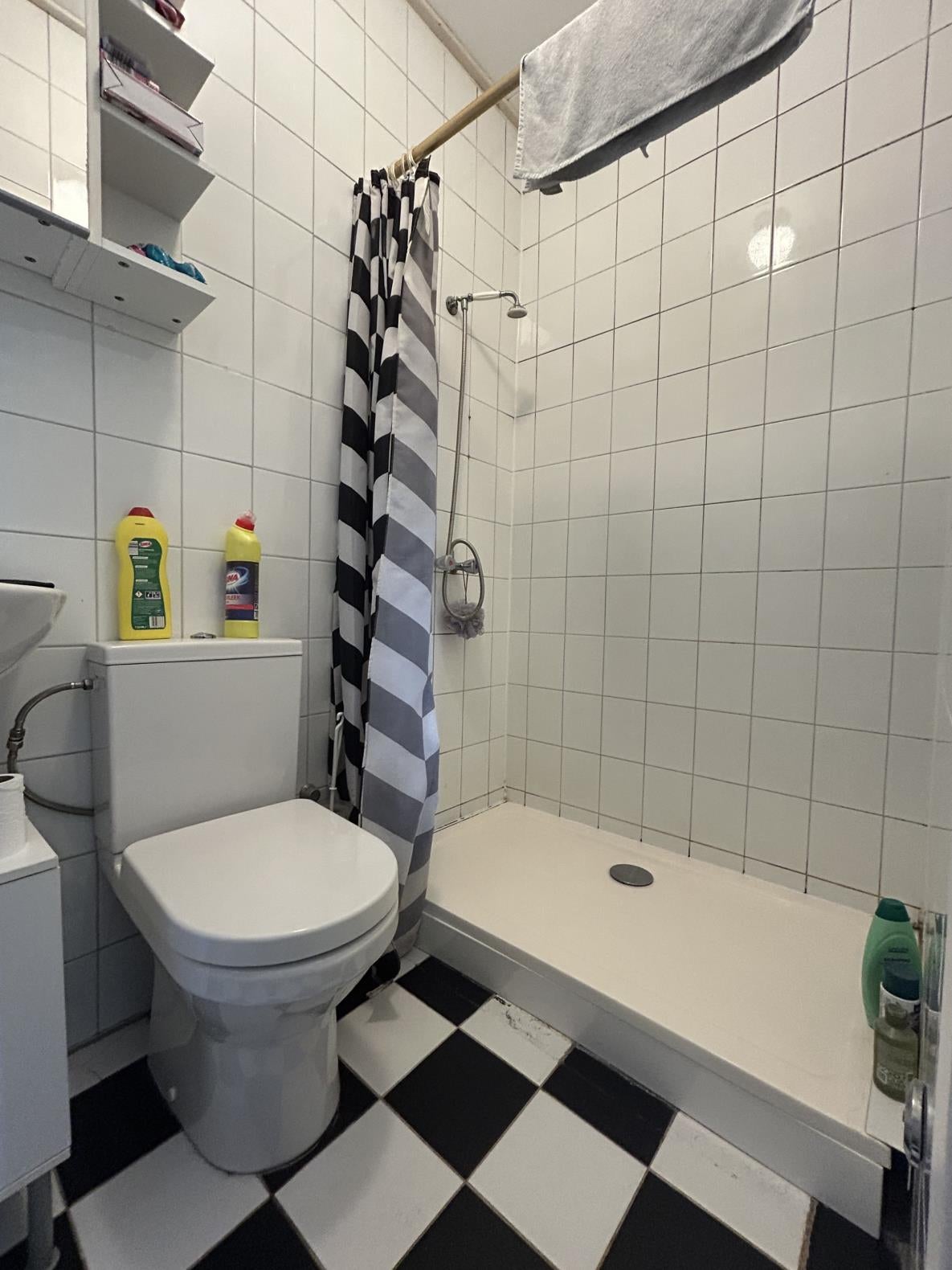 De keuken geeft directe toegang tot de badkamer. De badkamer is voorzien van spoelbak, douche en toilet.