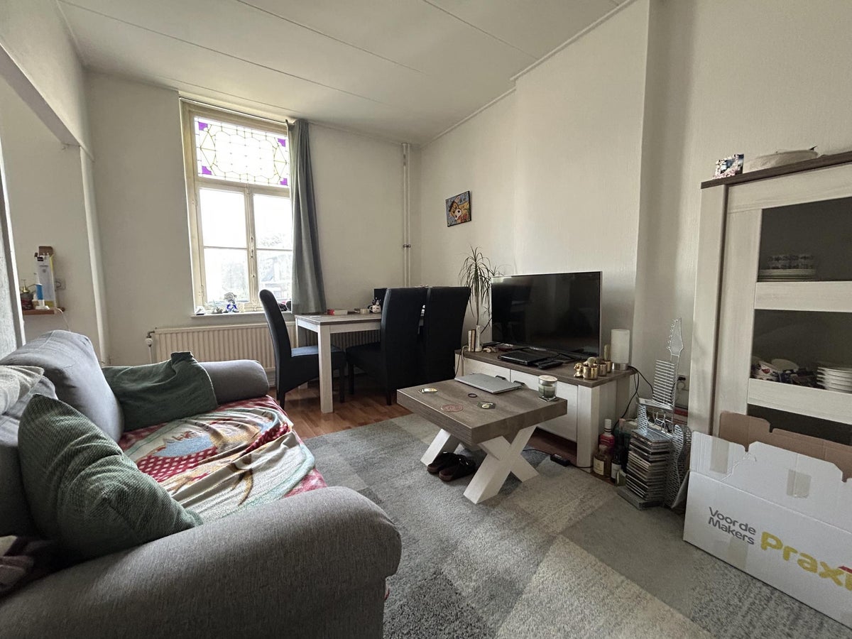 Vanuit het trappenhuis heeft met toegang tot het appartement. Sfeervolle woonkamer geeft zowel toegang tot de keuken als de slaapkamer. Het slaapgedeelte is gescheiden middels een deur.