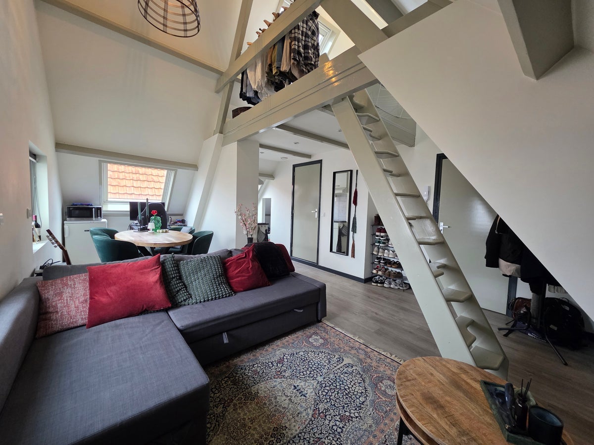 De woonkamer is enorm sfeervol en boven de woonkamer heb je een vide waar zich een apart slaapgedeelte bevindt. Hierin past een 2-persoonsbed.