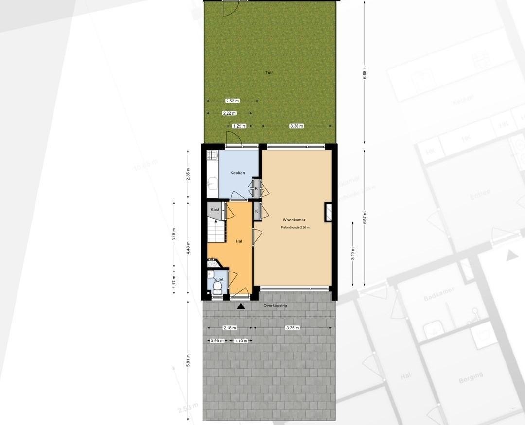 Ruimtes gezamenlijk: badkamer, kantoor/logeerkamer, woonkamer, keuken, wijnkelder, voor- en achtertuin (afmetingen zie je op de foto's).