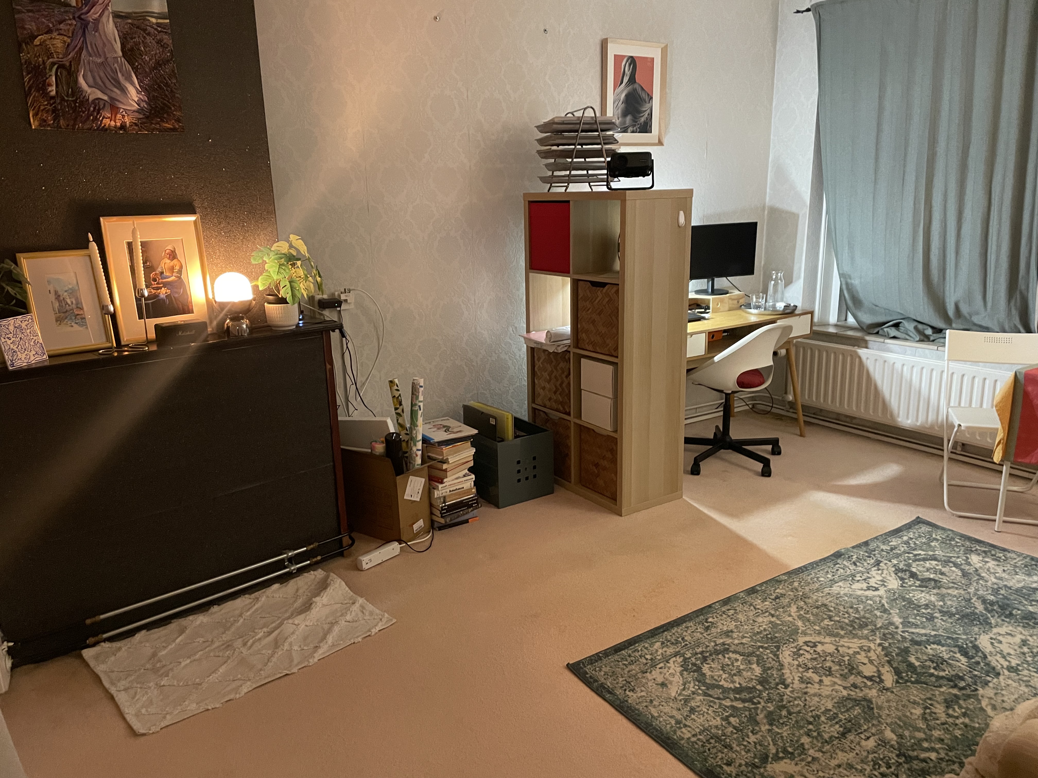 Het huis is vrij ruim, met een comfortabele woonkamer; maar 5 minuten fietsen van het station en 30 minuten fietsen van de TU Delft. Er komen vrij een slaapkamer van 7 m2 en een kantoorruimte van 4.5 m2 (rond 12 m2 aan totale oppervlakte dus).