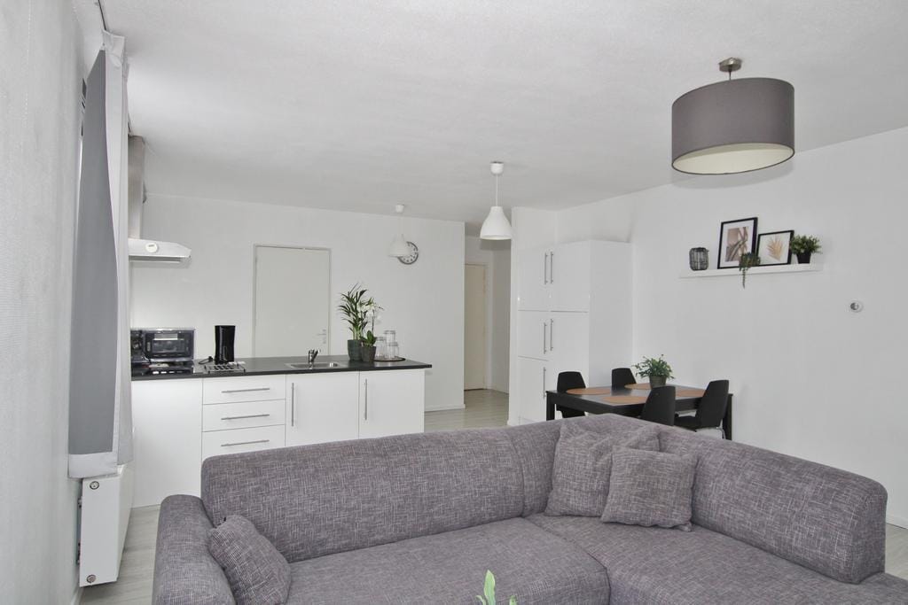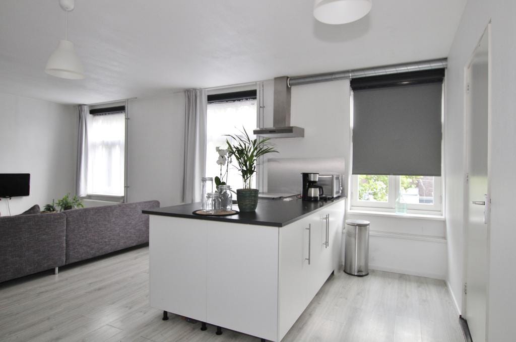 Hal, toilet met fonteintje, lichte woonkamer, open moderne keuken met net keukenblok voorzien van een inductiekookplaat, combimagnetron, afzuigkap, koelkast met vriesvak, betegelde badkamer met douche en wastafelmeubel, ruime slaapkamer met 2-persoonsbed.