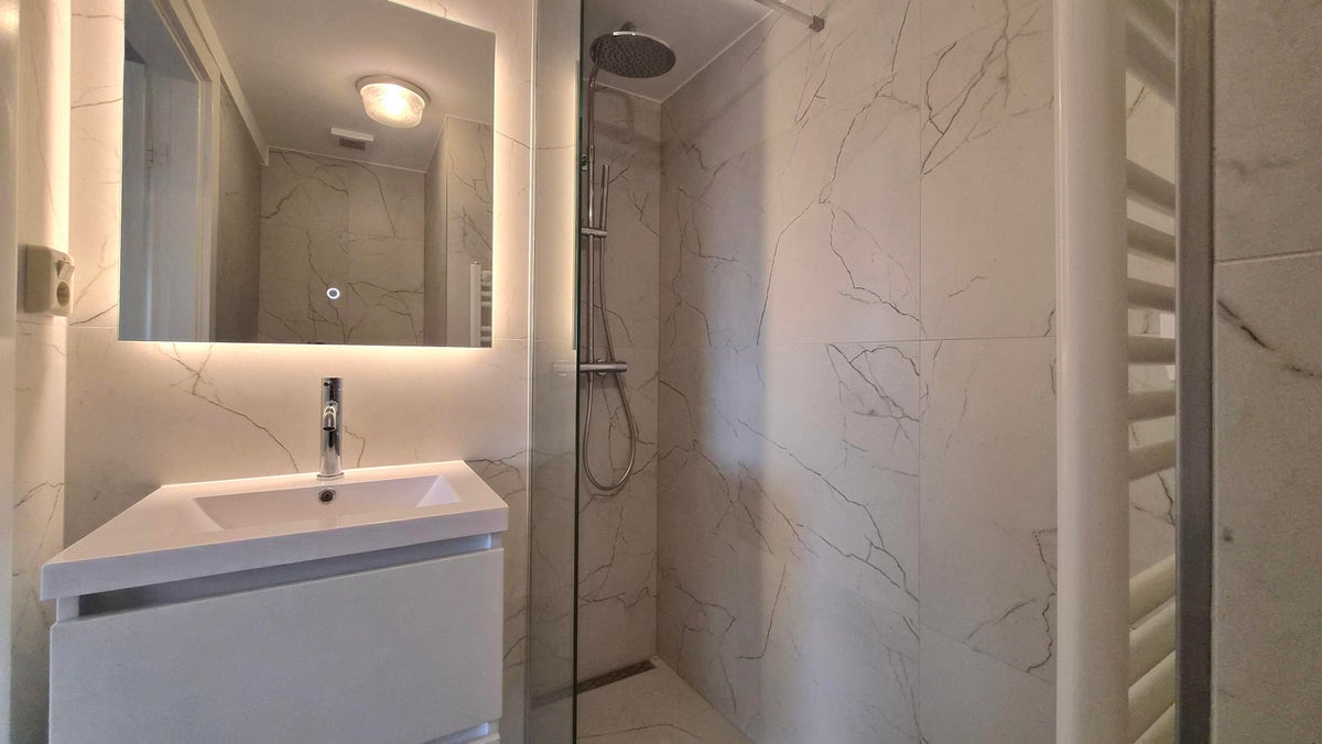 De keuken is voorzien van 4-pits gaskookplaat, afzuigkap, koelkast en combimagnetron en een wasmachine aansluiting. Verder is dit appartement voorzien van een heerlijke slaapkamer en luxe badkamer welke voorzien is van een douche, vaste wastafel, toilet.
