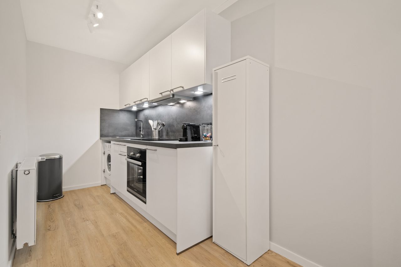 Het hoogwaardig gerenoveerde appartement heeft een uitnodigende woonkamer met een moderne tafel, een comfortabele designbank en een grote tv. Bovendien biedt het appartement een op maat gemaakte keuken met de nieuwste technologie en de bijbehorende volledige uitrusting (koelkast met geïntegreerde vriezer, keramische kookplaat en een grote selectie aan keukengerei) - niets staat een diner voor twee in de weg! Daarnaast nodigt het prachtig gelegen balkon uit om heerlijk te ontspannen en te genieten van de zonuren..