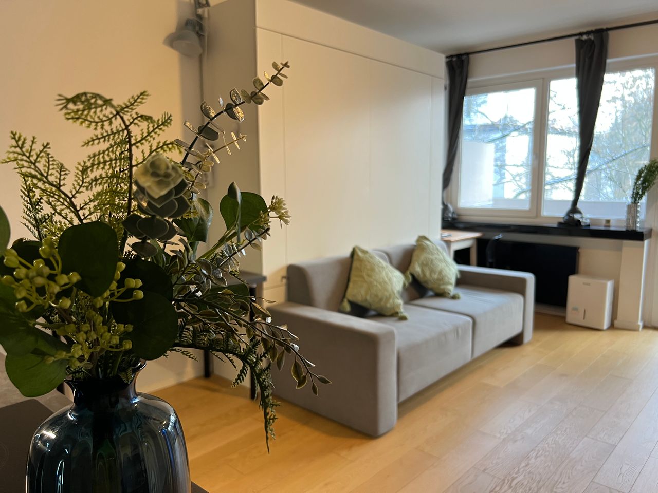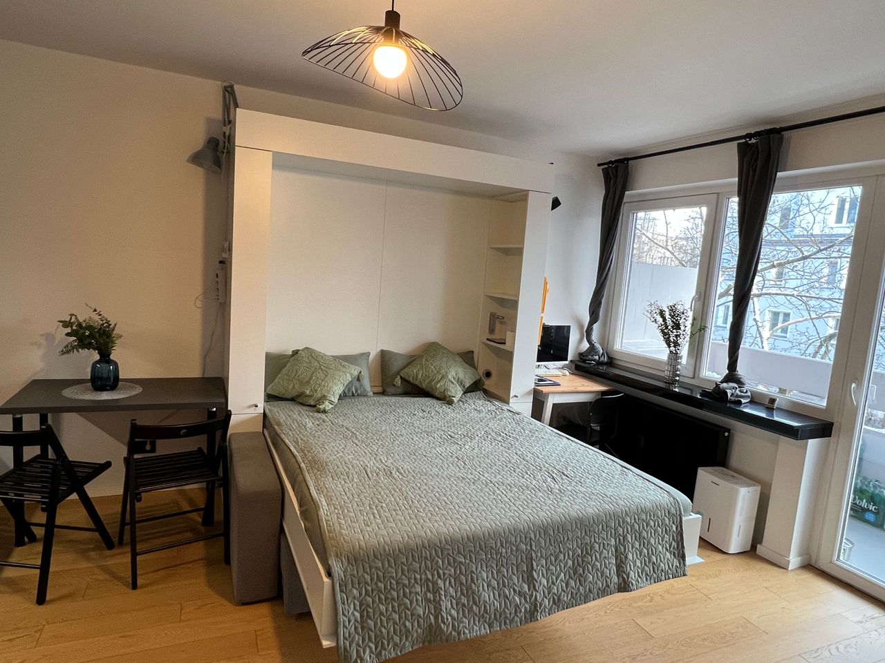 Studio-appartement met panoramisch balkon en volledig uitgeruste keuken en badkamer.