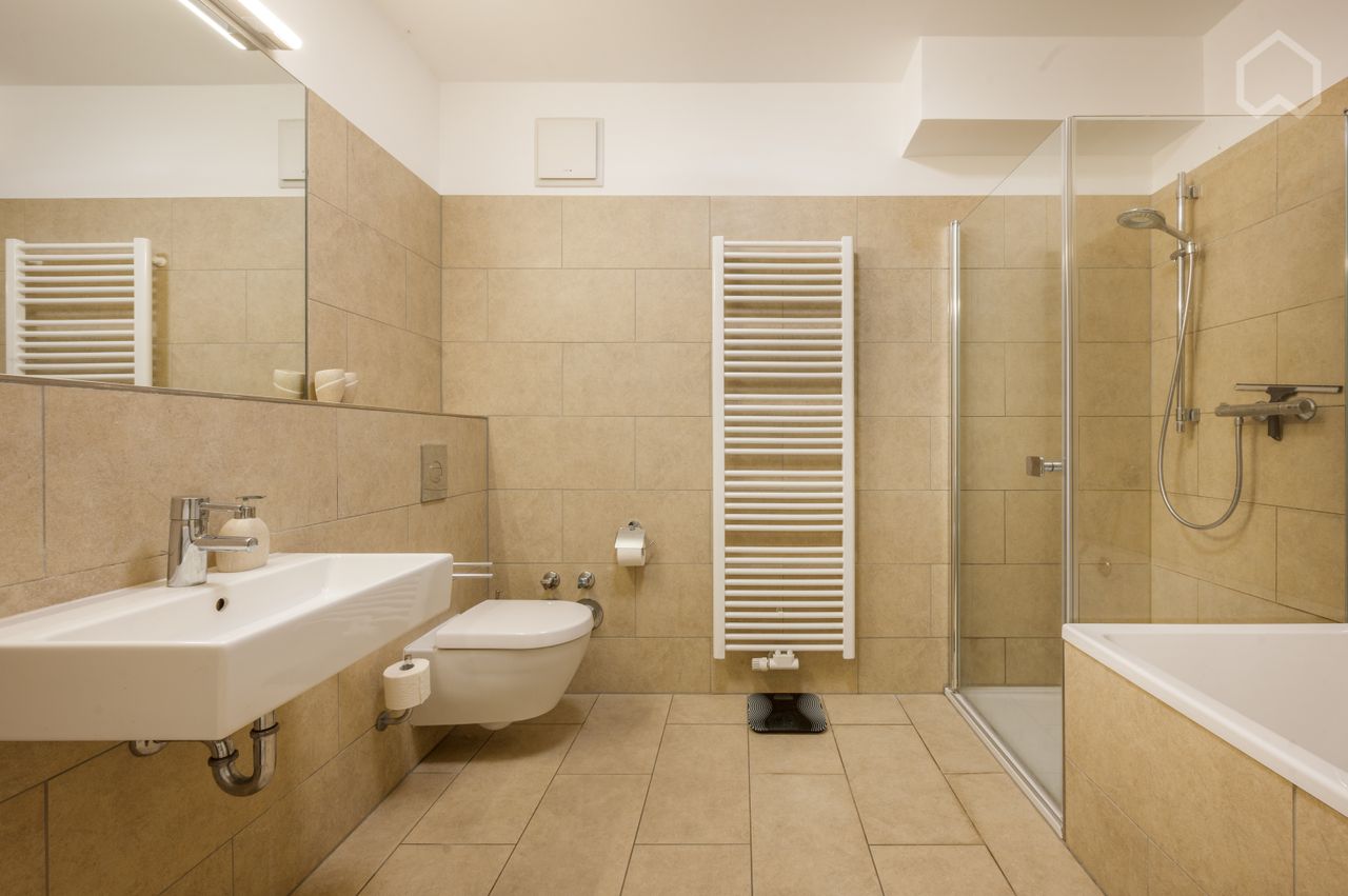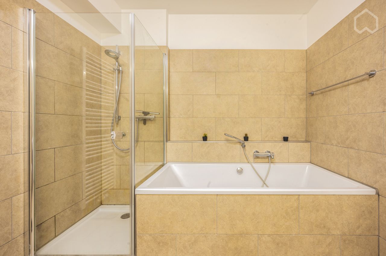 De badkamer is uitgerust met zowel een ligbad als een Villeroy & Boch douche.