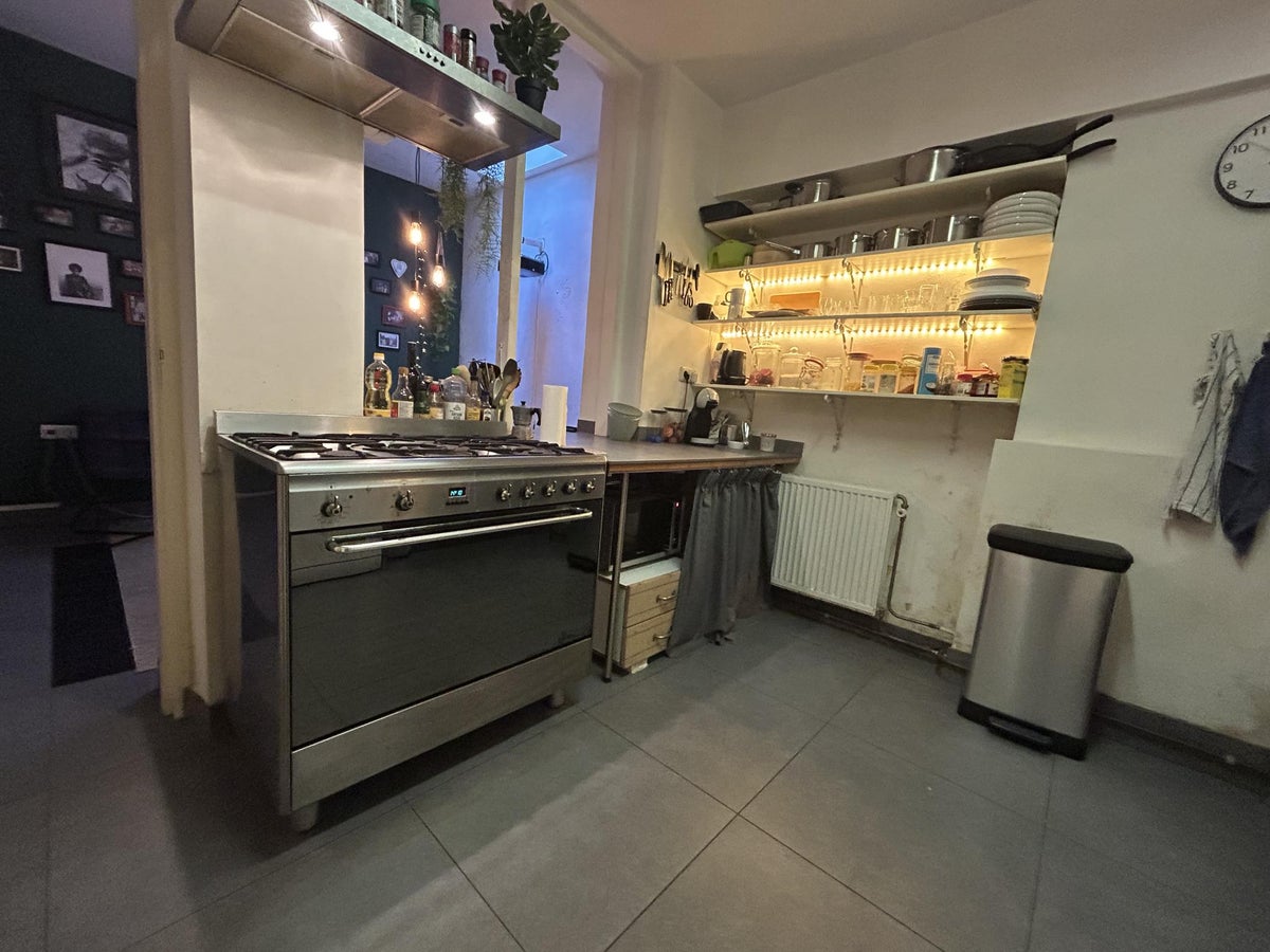 Vanuit de slaapkamer kom je in een ruimte die toegang biedt tot het toilet en de badkamer. Verder door bevindt zich de leefkeuken uitgerust met diverse inbouwapparatuur, waaronder een vaatwasser, combi-oven, koelkast met vriesvak, inductiekookplaat, wasmachine en afzuigkap, met voldoende ruimte voor een eetkamertafel.