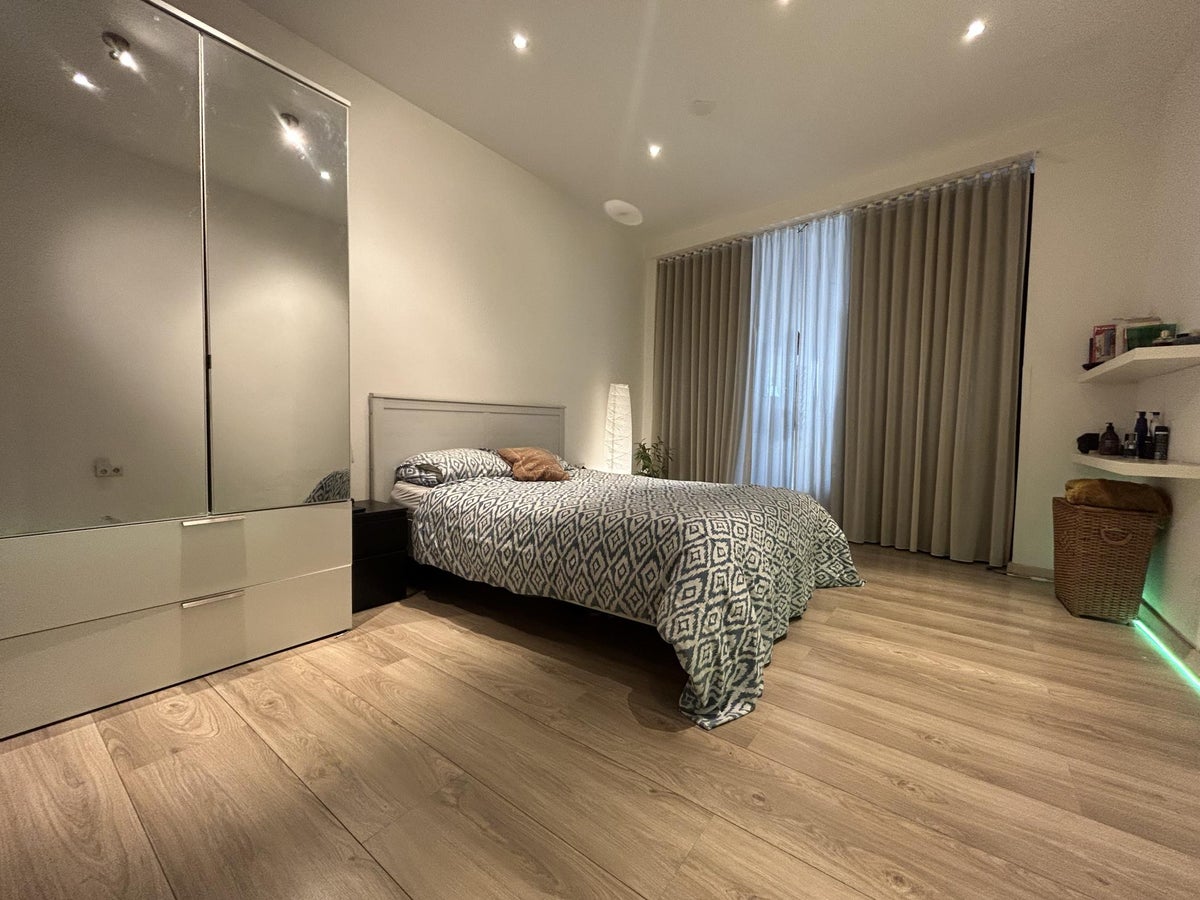 Wanneer je verder doorloopt, bereik je de slaapkamer, die is afgescheiden met gordijnen.