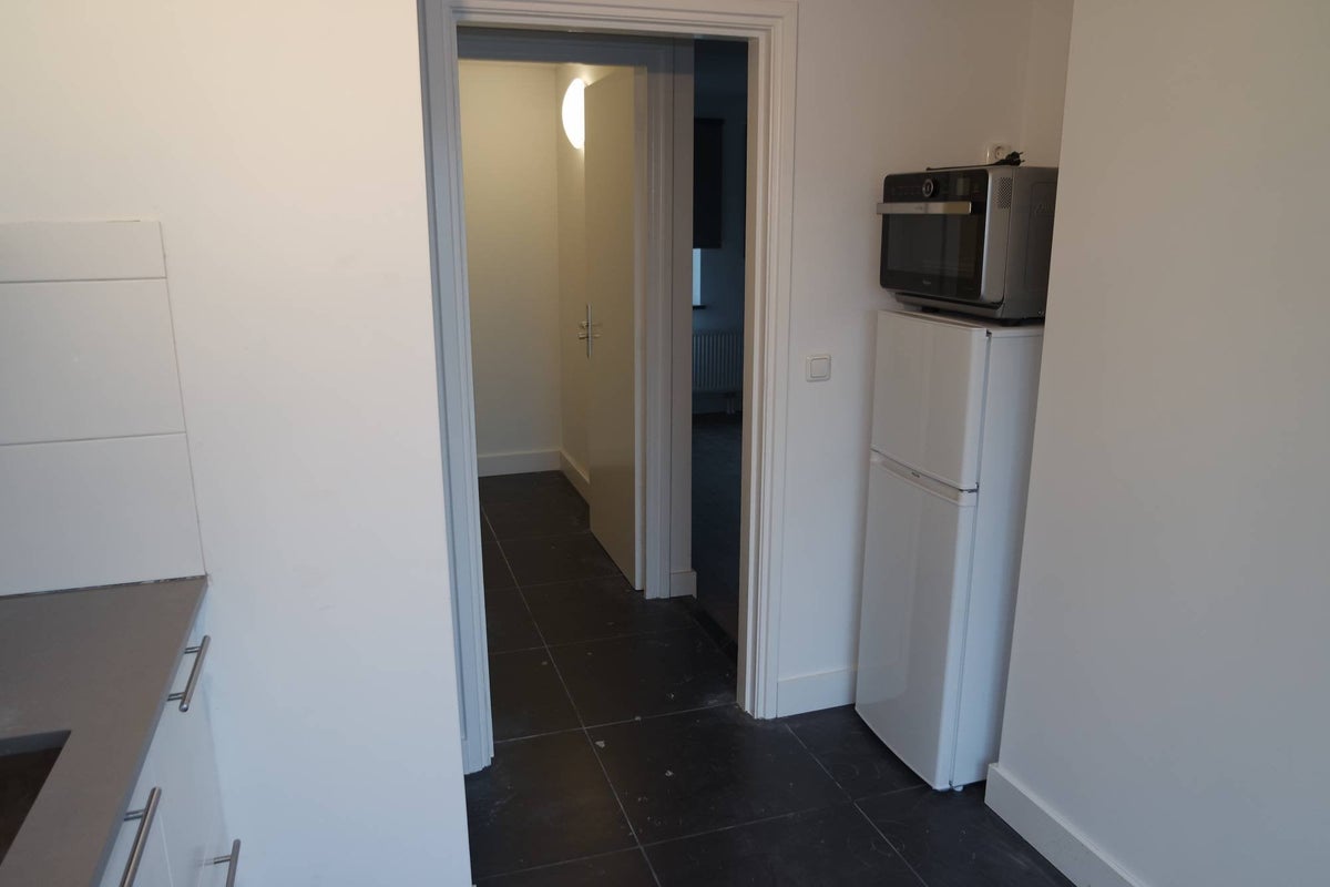 Moderne separate keuken met tegelvloer, voorzien van koelkast met vriesgedeelte, oven, gasfornuis en afzuigkap. De keuken geeft toegang tot een ruim dakterras.