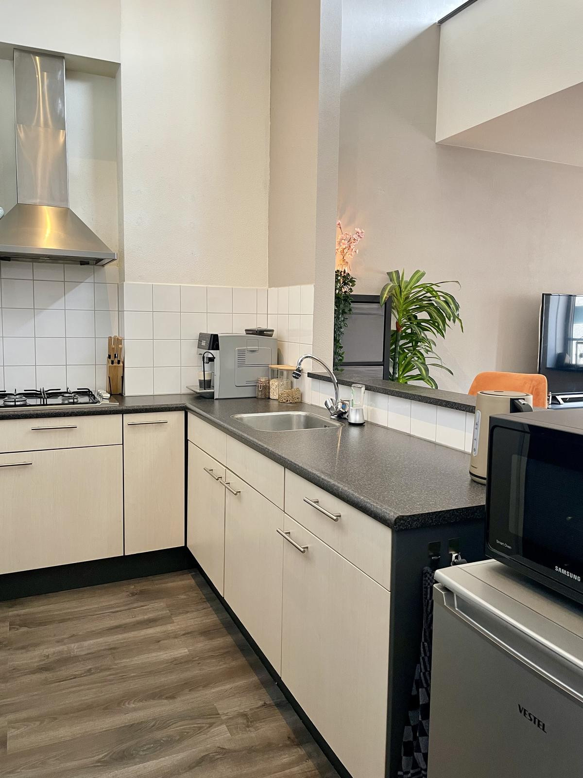 Het complex is uitstekend afgewerkt en de appartementen en gemeenschappelijke ruimtes zijn voorzien van diverse lichtstraten zodat er voldoende lichtinval in het appartement is. Indeling: Eerste verdieping: Entree/hal met toegang tot alle ruimtes. Ruime woonkamer met open keuken. De keuken is voorzien van een gasfornuis en afzuigkap.