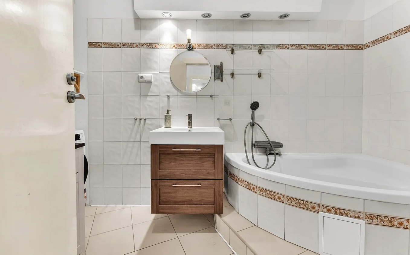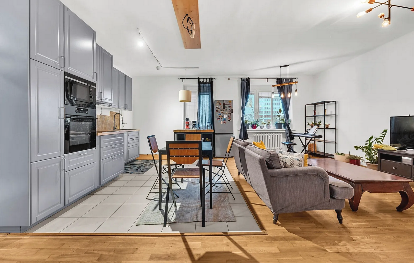 Twee aparte, ruime slaapkamers, een gedeelde en zeer ruime woonkamer met kitchenette. Vanuit de hal is er een aparte ingang naar de badkamer, en het toilet is ook apart.