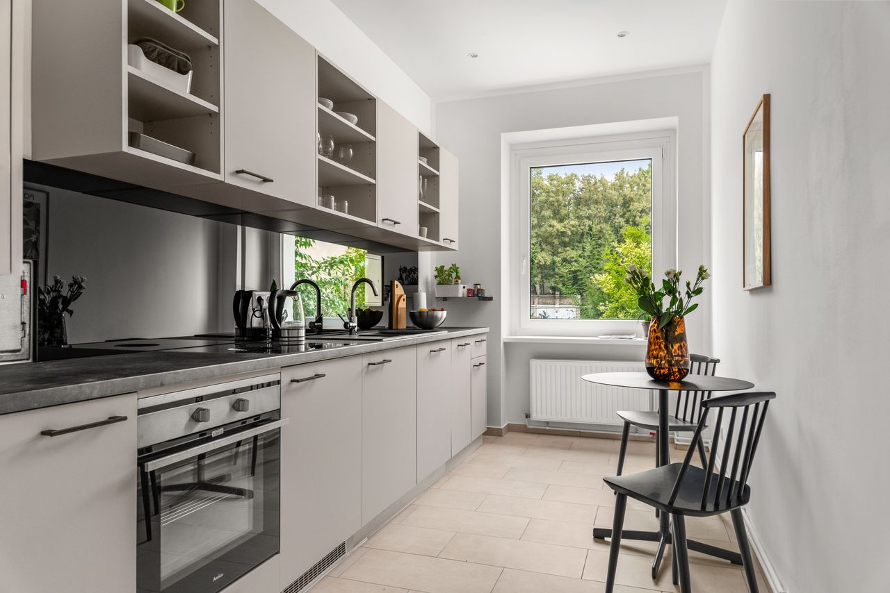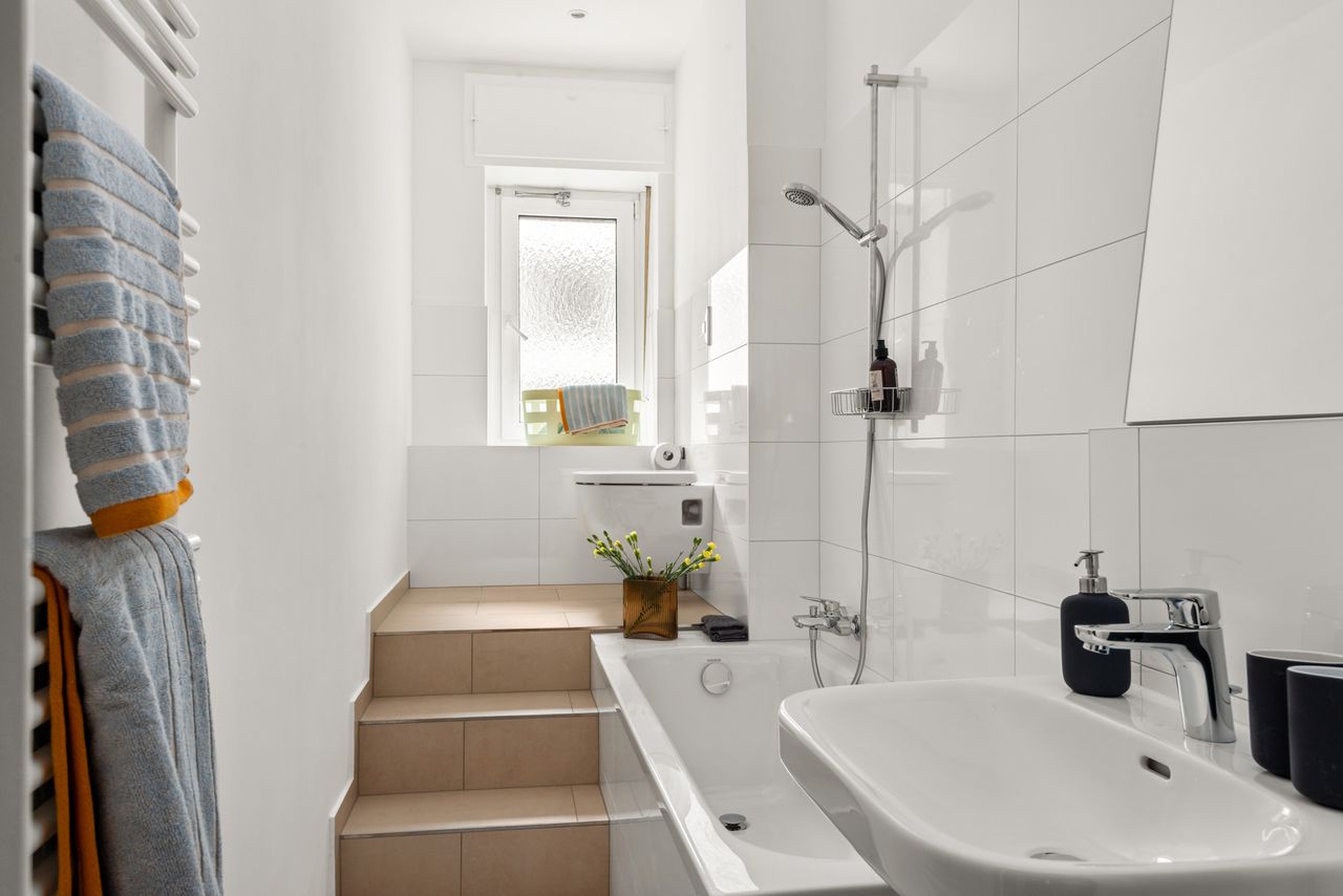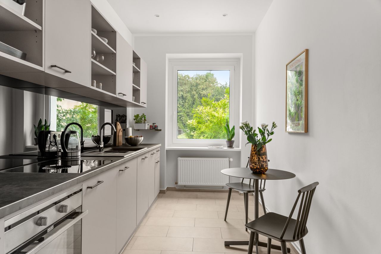 De badkamer nodigt u uit om te ontspannen met het grote bad en het raam dat veel natuurlijk licht binnenlaat. De moderne keuken met grote raampartijen en alles wat je hartje begeert, van het Bora fornuis tot de gezellige eethoek met ronde tafel en praktische stoelen, is de perfecte plek om je favoriete gerechten te creëren.