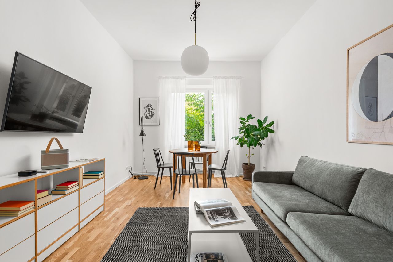 Sluit de dag af in de ruime woonkamer met een comfortabele bank van 2 meter en een grote 55-inch 4K-tv, of berg uw favoriete boeken op in de kledingkasten en het elegante dressoir.
