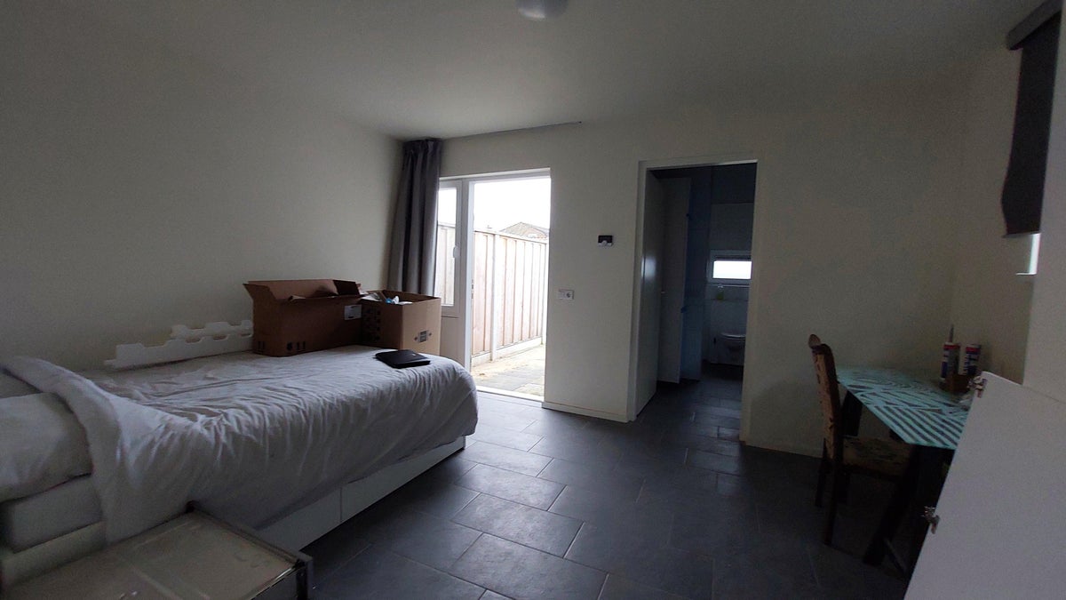 Entree in de woonkamer van ongeveer 16 m². Doorloop naar slaapgedeelte van ruim 12 m² met toegang tot gedeelde achtertuin van 4,50 x 15,00 meter.