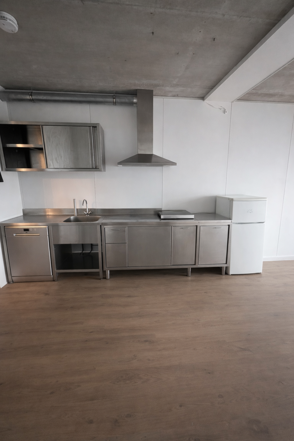 De open keuken is uitgerust met een inbouw afzuiginstallatie en een lang aanrechtblad van meer dan twee meter, wat de ruimte praktisch en comfortabel maakt in gebruik. Aangrenzend bevindt zich de moderne badkamer, uitgevoerd met een douche, hangend toilet en wastafel.