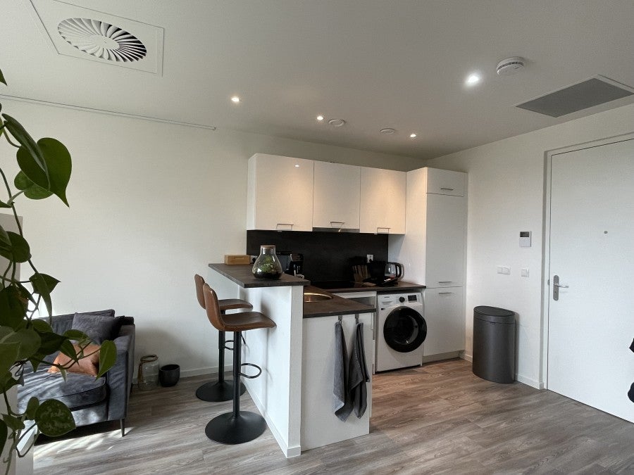 Als je binnenkomt heb je een hoekkeuken met afzuigkap, inductie kookplaat, combi-magnetron, koelkast en vriezer. Onder het aanrechtblad is ook een aansluiting en afvoer voor een wasmachine gemaakt.