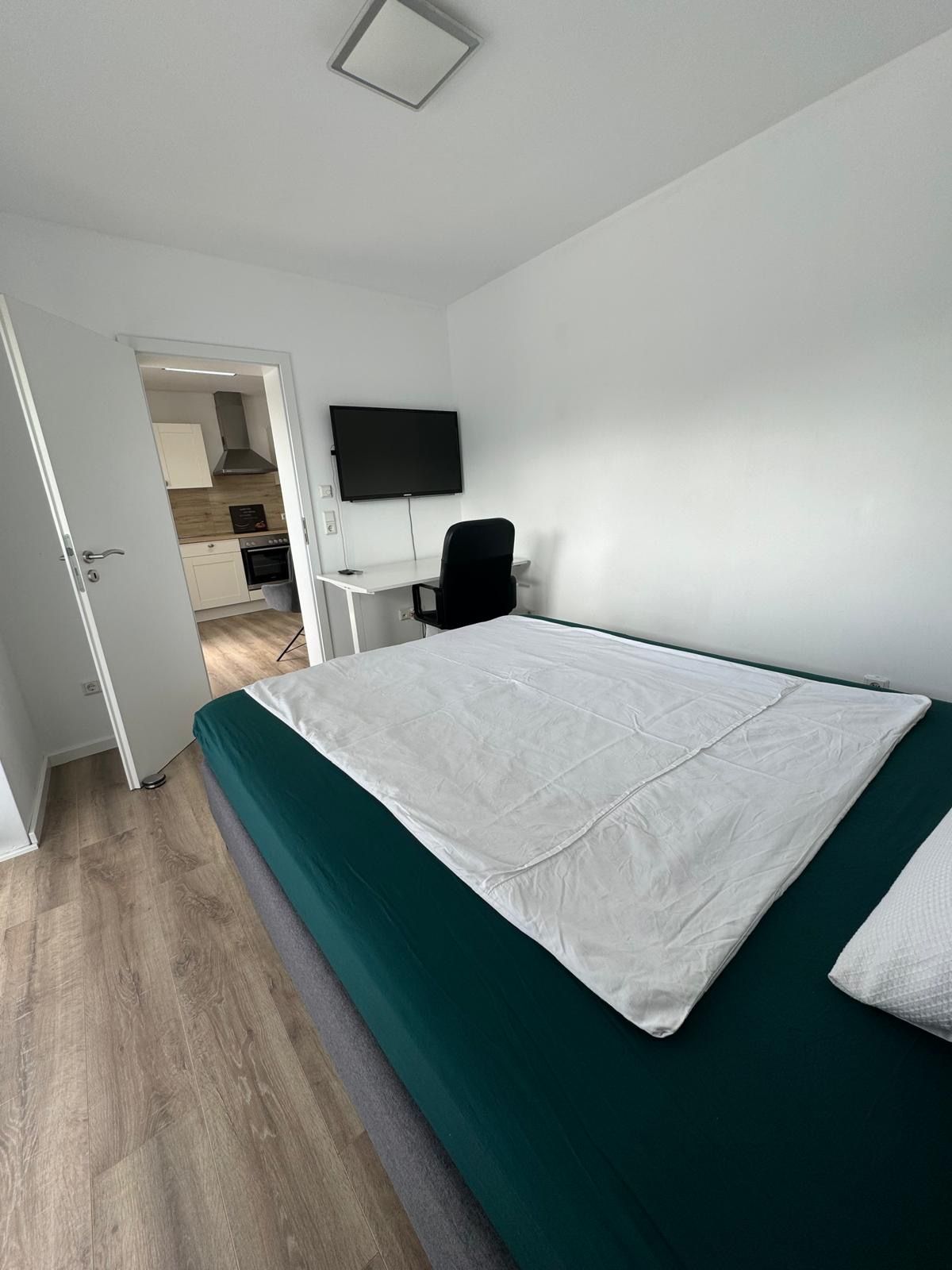 Het appartement biedt een gezellige slaapkamer, een volledig uitgeruste keuken, een woonkamer met een slaapbank en een balkon.