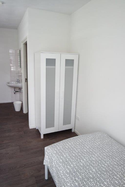 De gemeubileerde kamer is uitgerust met een bed, bureau en kast.