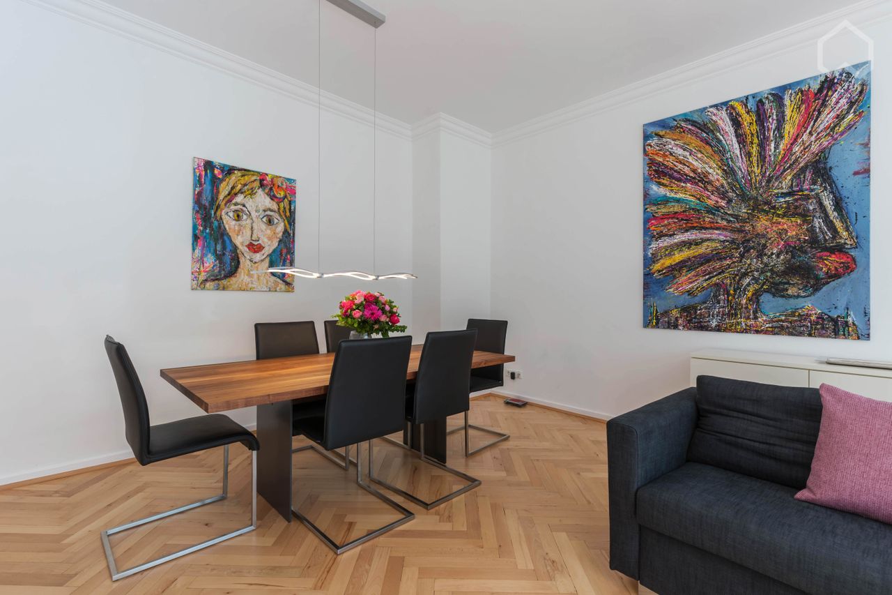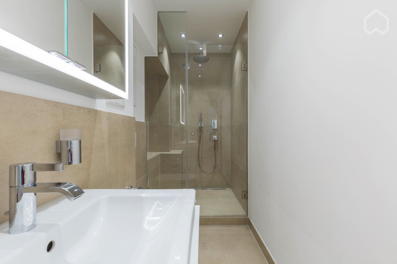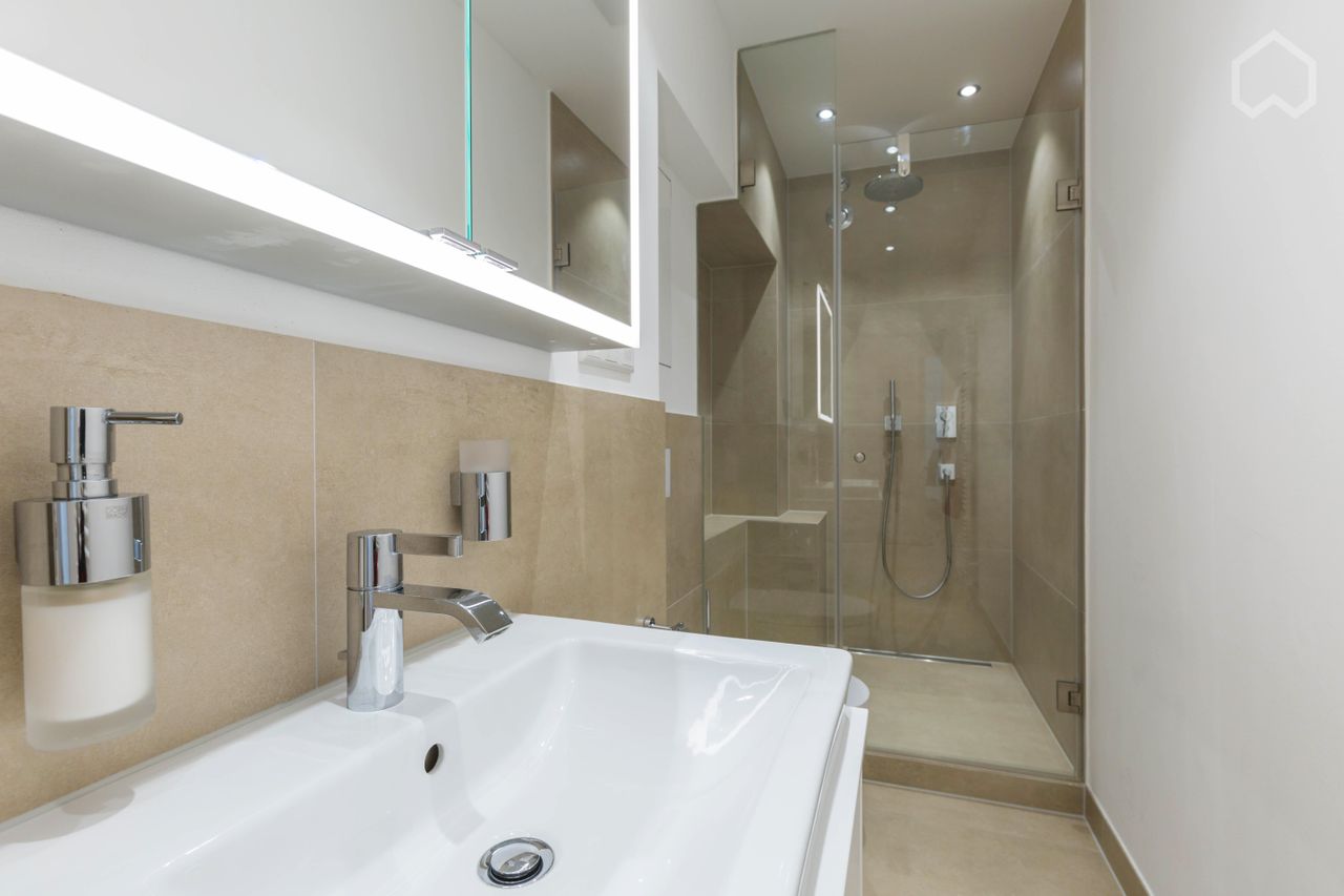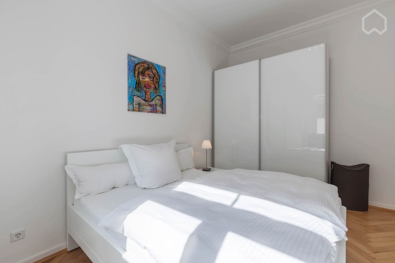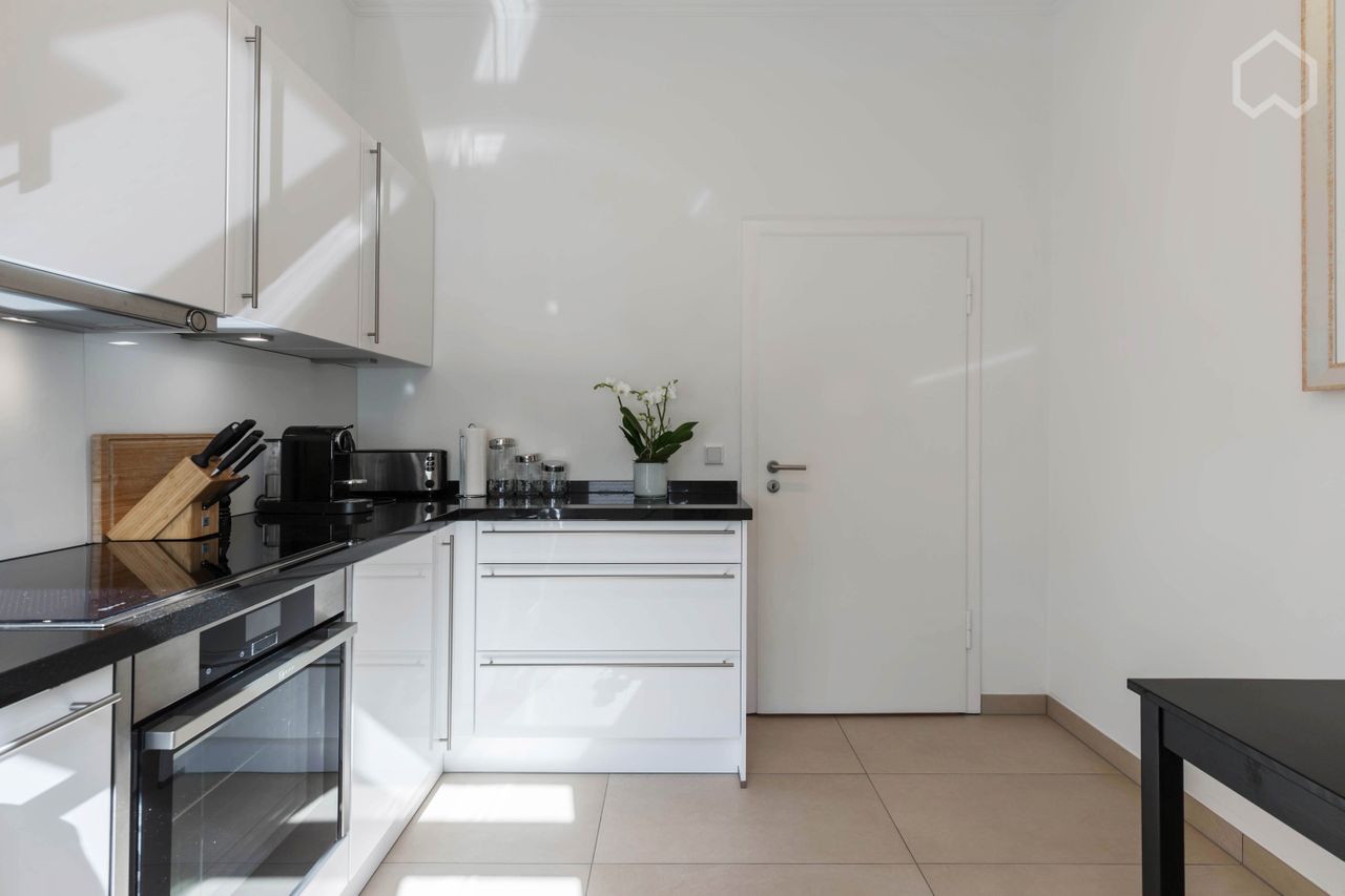 Woonkamer met hoogwaardige bank (tevens te gebruiken als slaapbank voor gasten), bureau, grote tafel met stoelen, wandmeubel met verlichte vitrinekasten, kabel TV, draadloze Sonus speakers en hoogwaardige parketvloer. Aparte, glanzend witte keuken met granieten werkblad, inductiekookplaat, oven, koelkast, vriezer, vaatwasser, koffiezetapparaat, magnetron en wasmachine met ingebouwde wasdroger. Witte slaapkamer met tweepersoonsbed (160 x 200 cm) en twee kledingkasten. Moderne badkamer met glazen douchecabine en ontspannende regendouche.