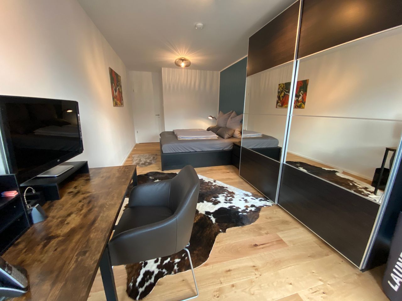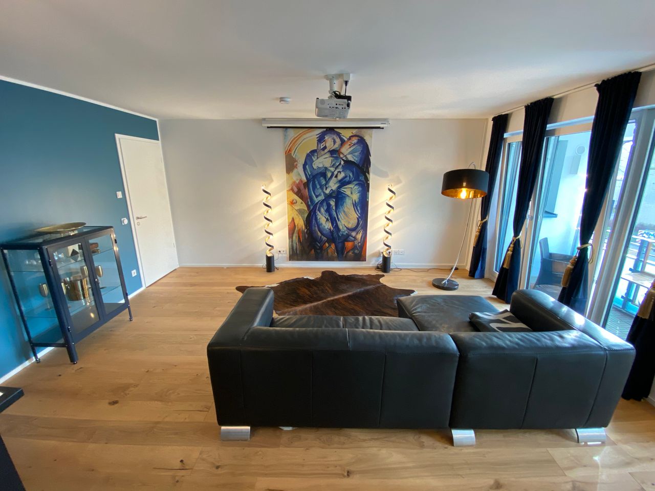 - Woonkamer met houten vloer en cv, tafel/werktafel met 4 leren fauteuils, beamer met aansluiting kabel TV (inclusief internationaal taalpakket) en internet plus Apple TV; WiFi overal in het appartement