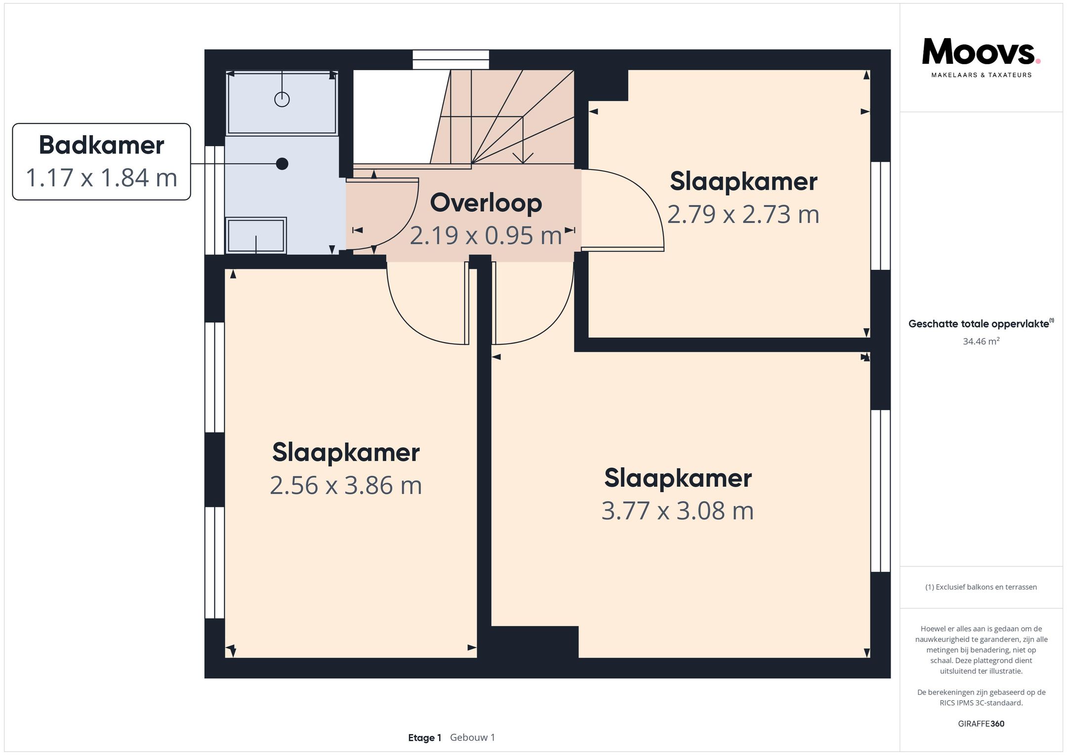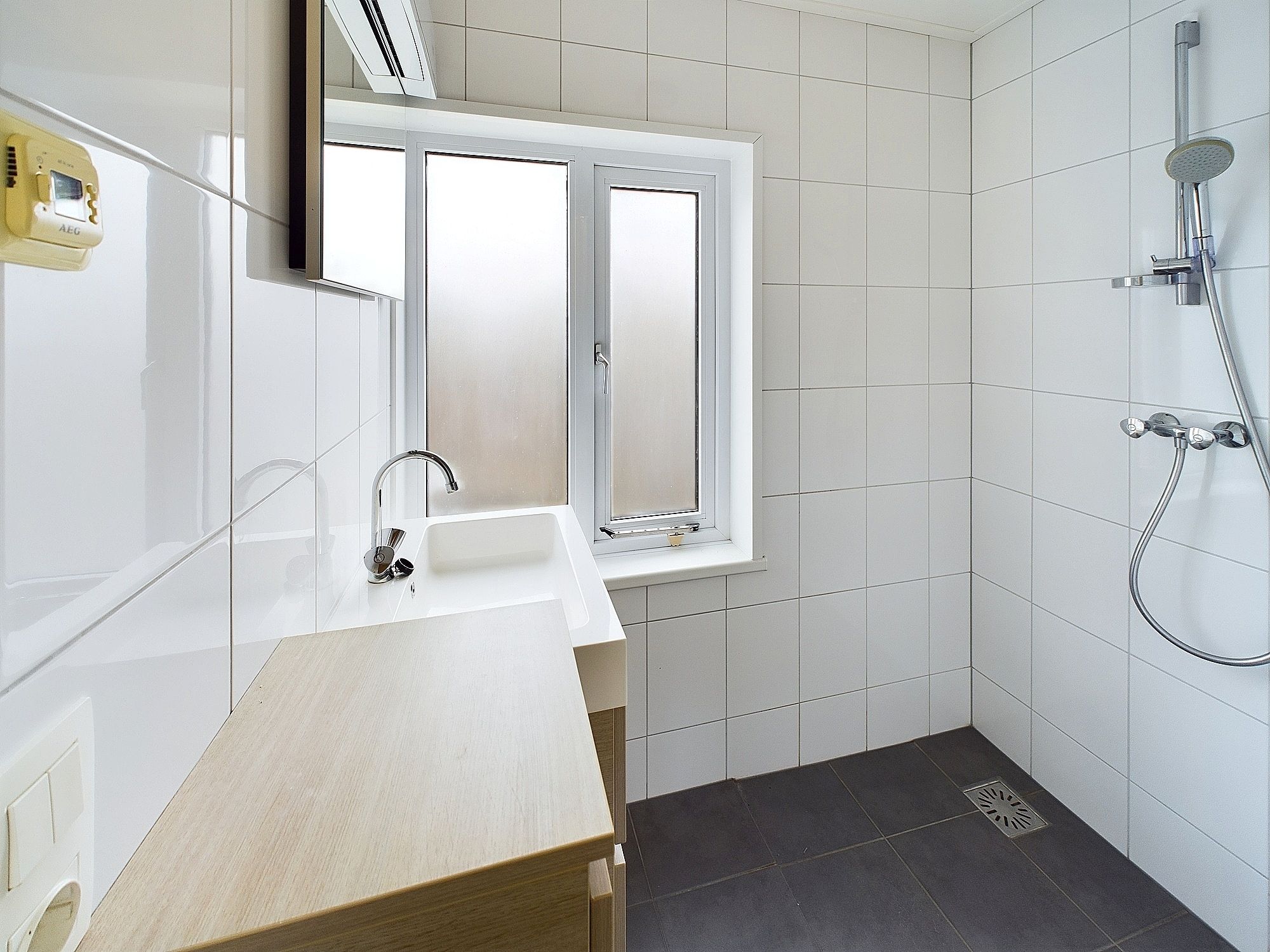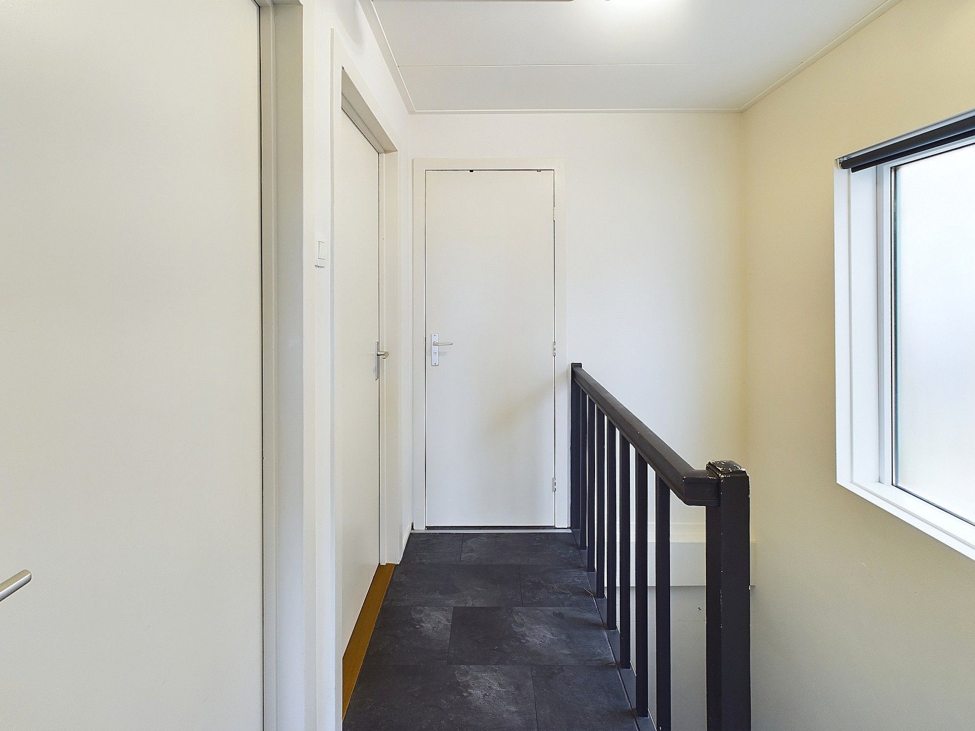 Overloop, 3 slaapkamers en badkamer met douche en wastafel.