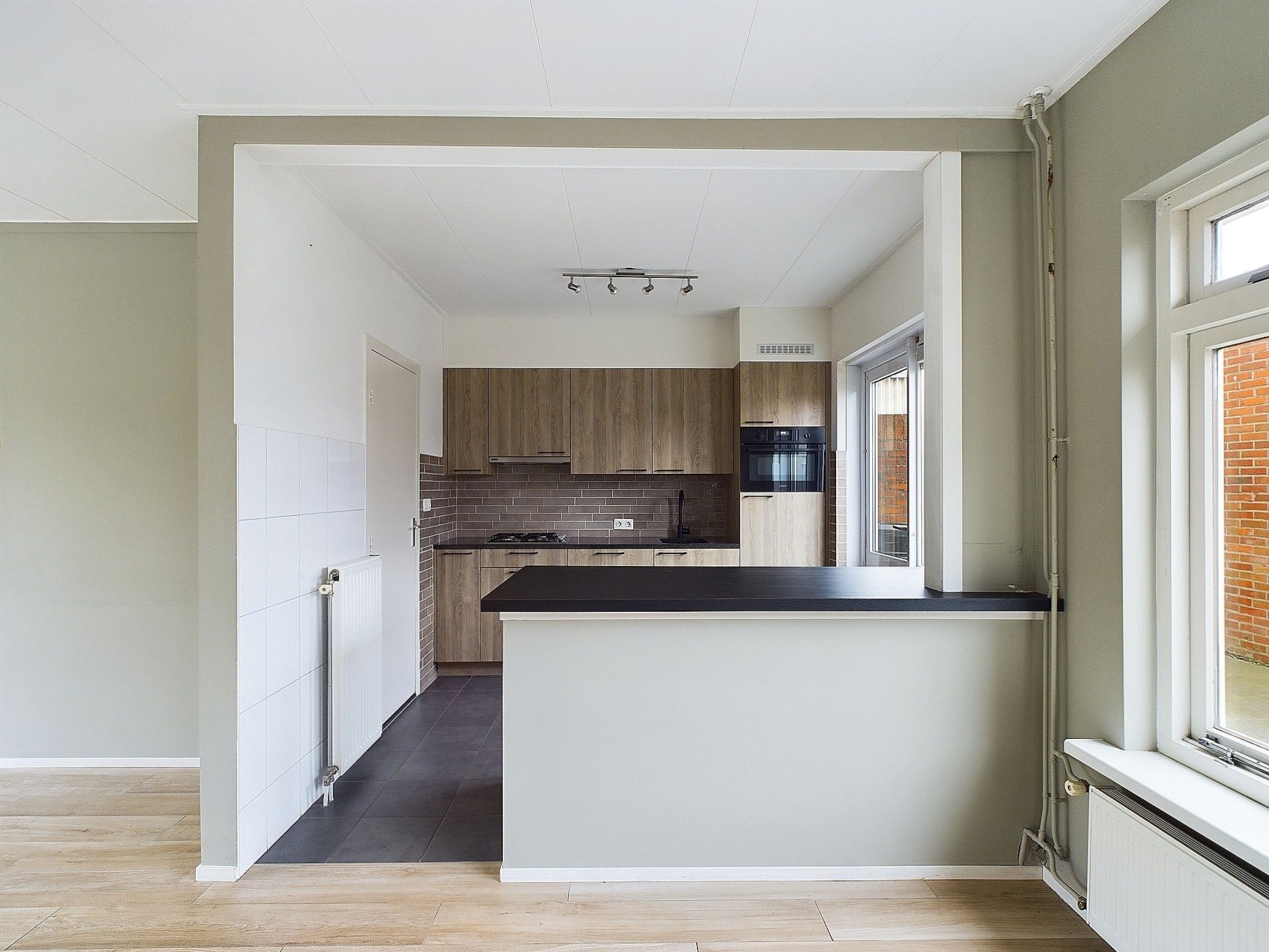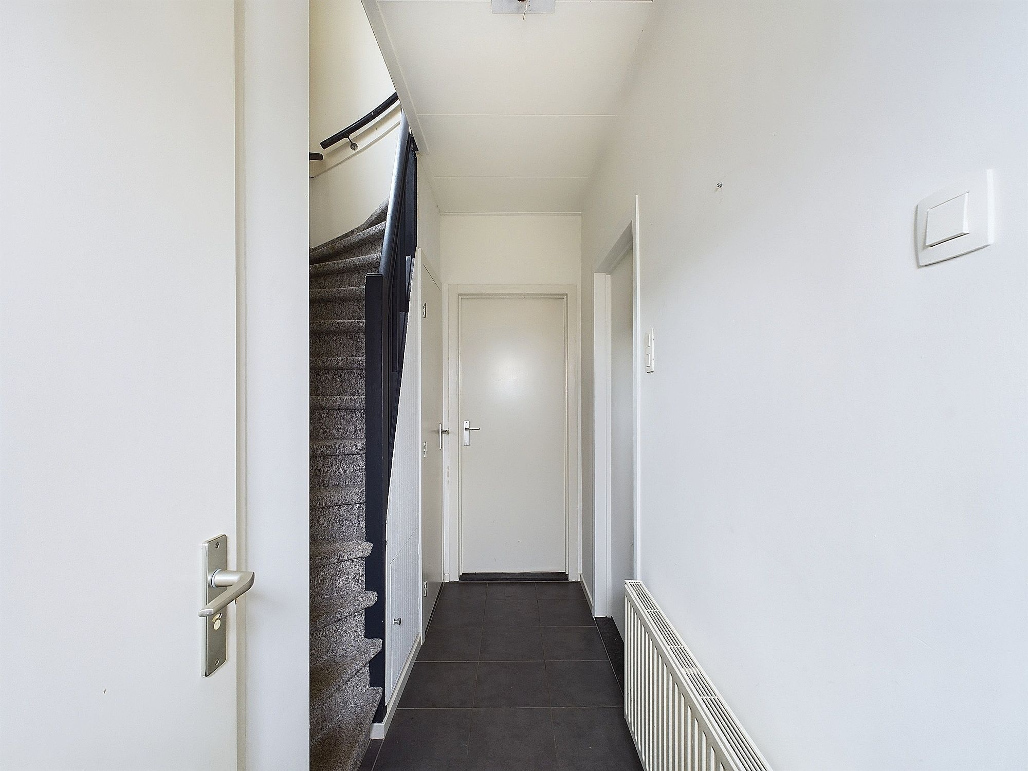 Inkomhal met meterkast, opgaande trap en toiletruimte. Woonkamer met nette pvc vloer en half open keuken.