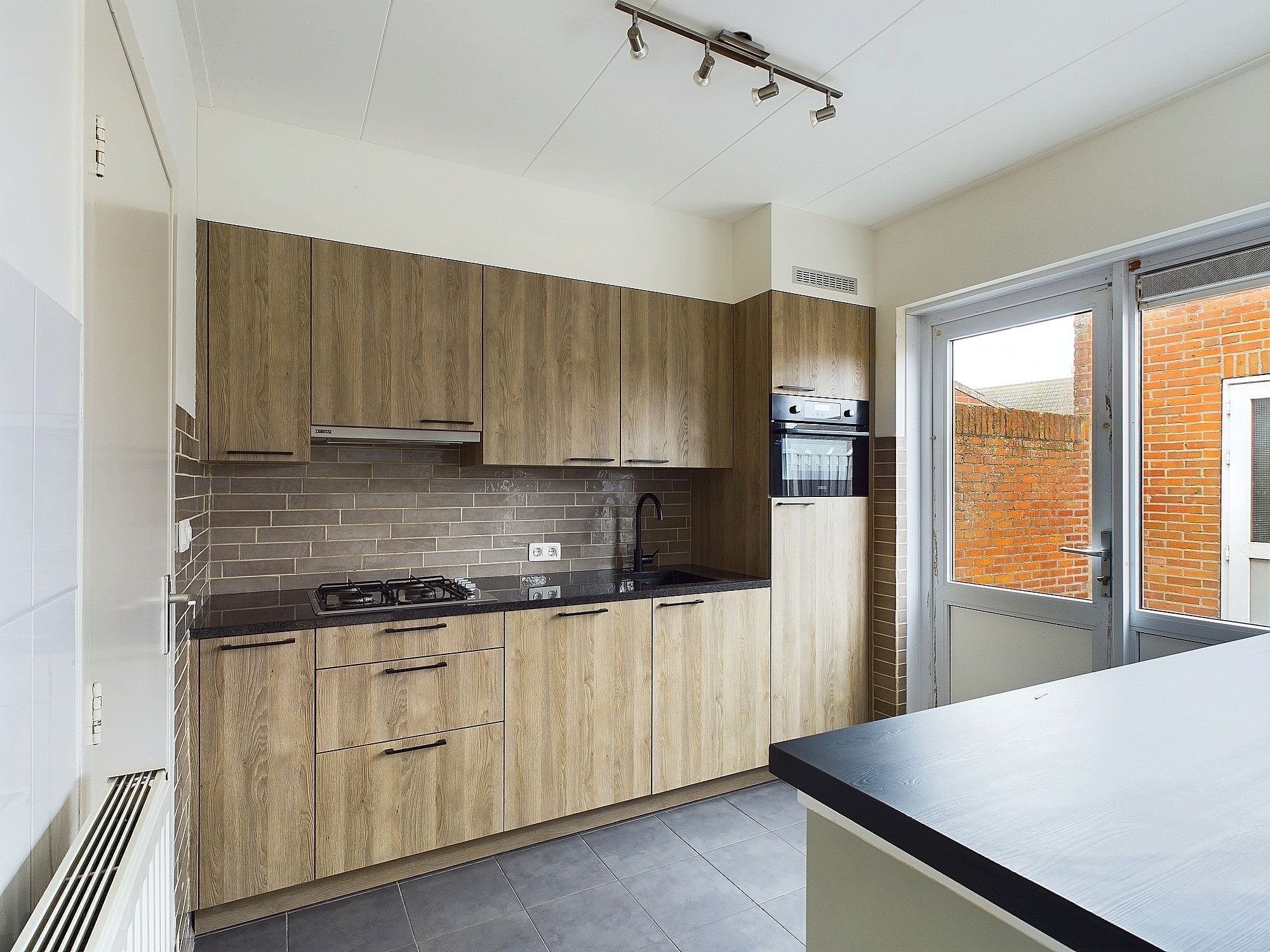 De keuken is recent gemoderniseerd en beschikt over inbouwapparatuur: 4 pits gasfornuis, afzuigkap, koelkast, oven en aansluiting voor de wasmachine. Gezellige bar en toegang naar de tuin.