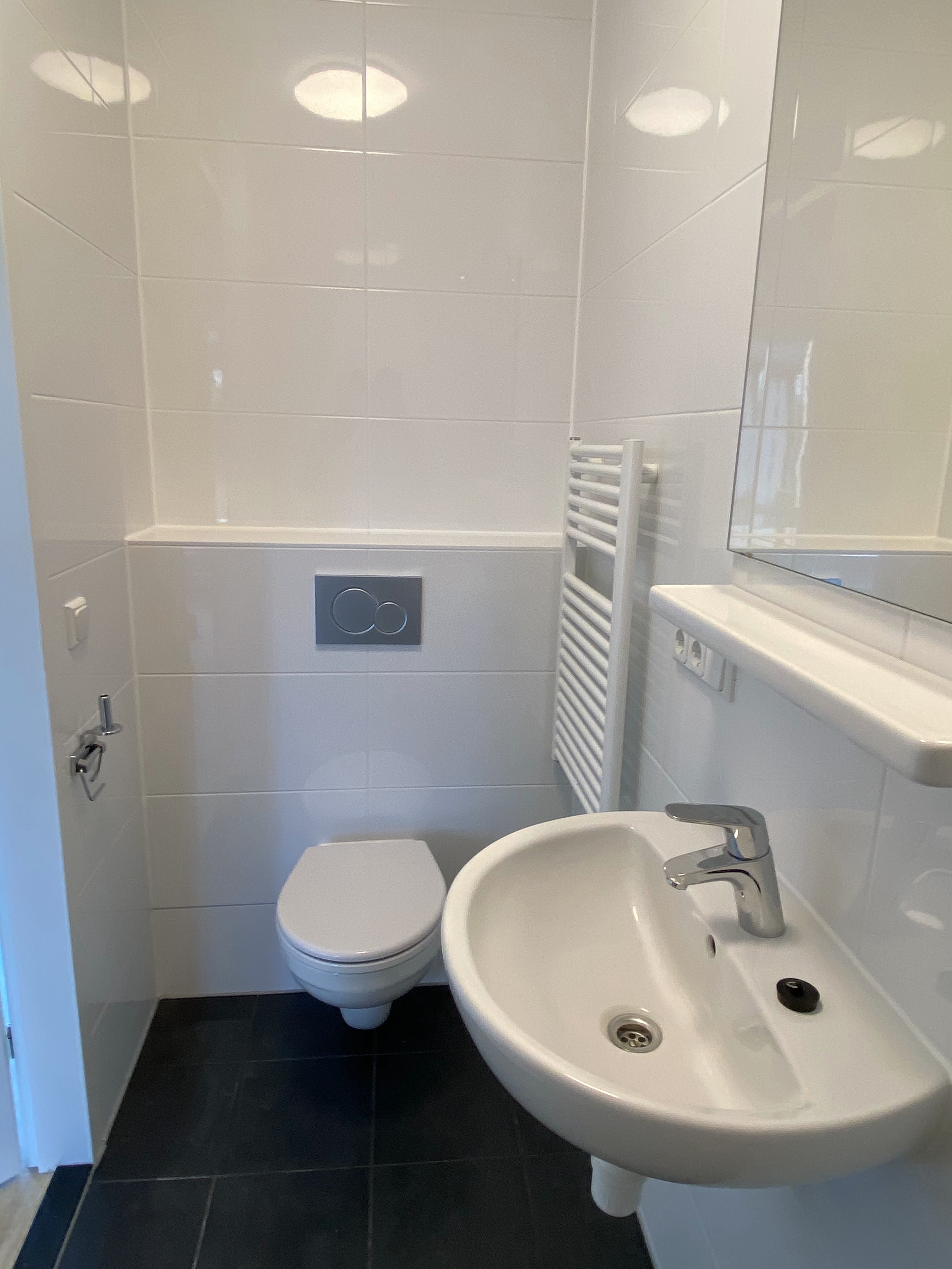 The kitchen is equipped with built-in appliances, including a fridge-freezer, induction hob, combi-oven and dishwasher., The living room provides access to the bathroom (fully tiled, fitted with a walk-in shower, washbasin and toilet) and the bedroom., The entire appartement has PVC flooring with underfloor heating. The apartment also has an intercom system., Every apartment in the complex is fitted with a heat pump, solar panels and double glazing.