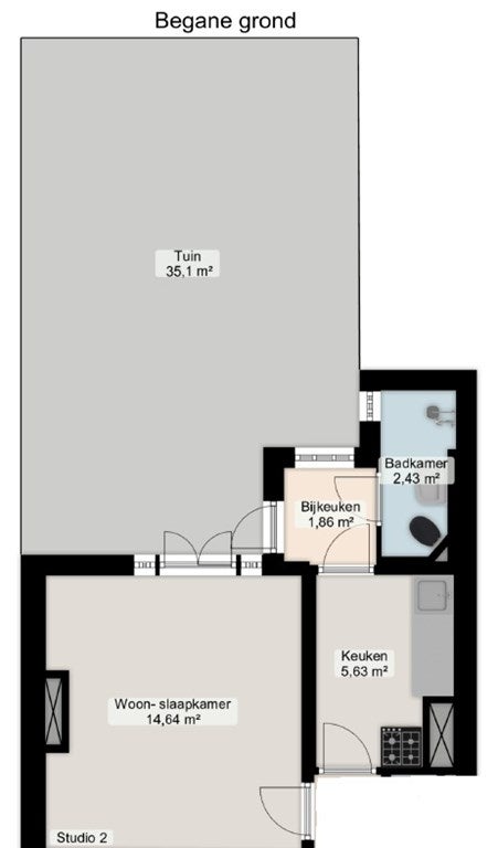 De badkamer beschikt over een douche, wastafel en toilet. Tot slot beschikt de studio over een ruime achtertuin.