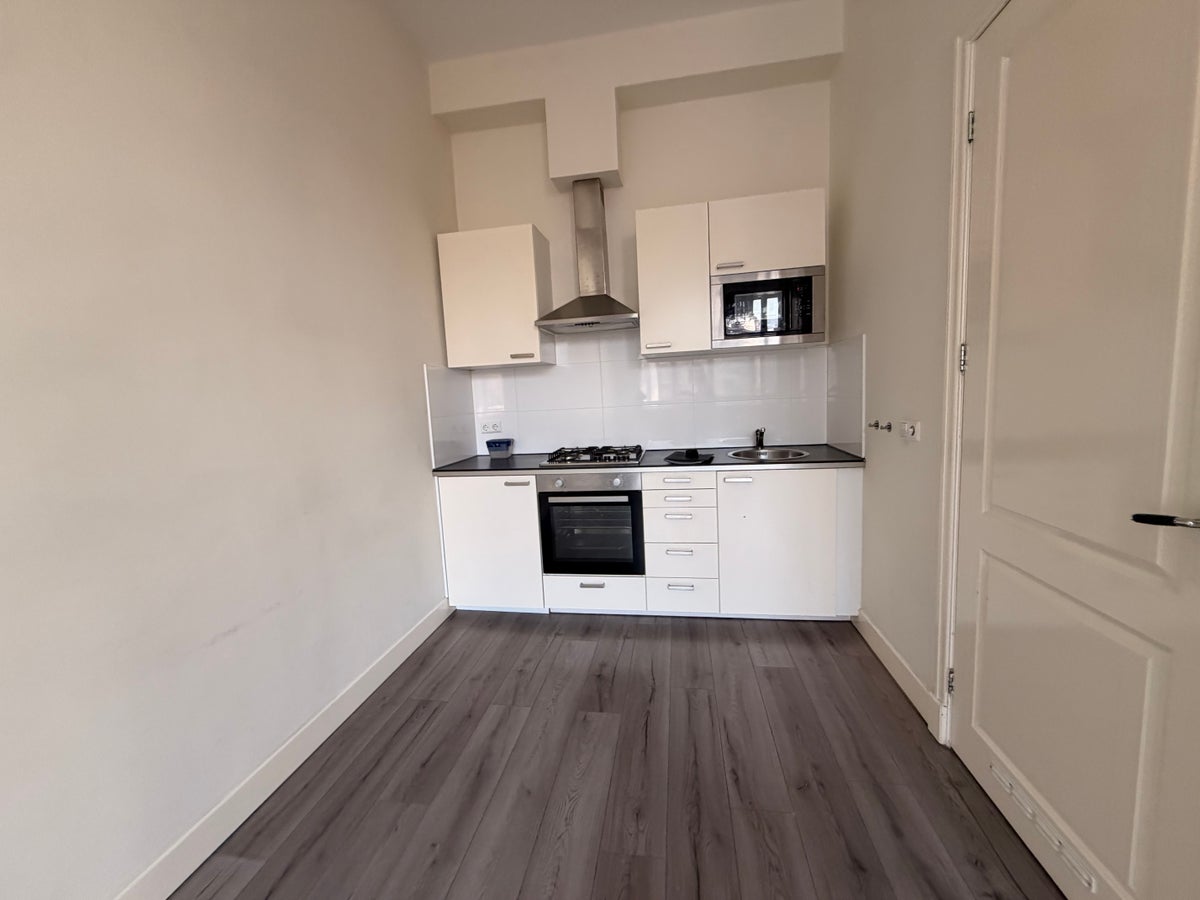 Middels het trappenhuis bereikt u de eerste etage, waar het appartement aan de achterzijde is gelegen. Via de entree komt u direct in de woonkamer van circa 25 m², die een prettige leefruimte biedt. De open keuken is voorzien van een kookplaat, koelkast, afzuigkap, oven en magnetron. De slaapkamer heeft een oppervlakte van circa 6 m².