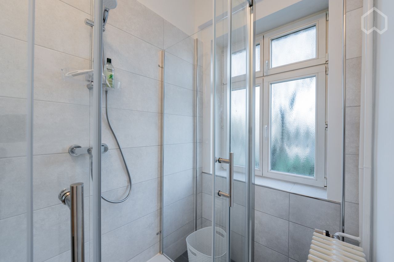 - Elegante en praktische badkamer: deze kamer heeft een moderne douchecabine, omgeven door transparant glas en met een luxe regendouche..