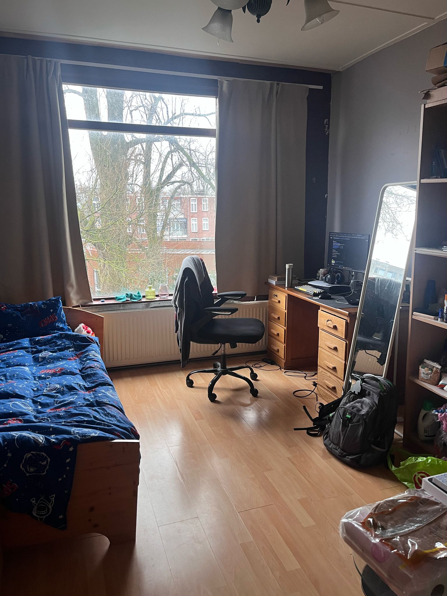 Op tien minuten loopafstand van de Haagsche Hogeschool een nette, ruime, volledig gemeubileerde kamer (bed, klerenkast, bureau, bureaustoel, boekenkast, beddengoed, bankstel, salontafel) te huur in een studenten woning met gebruik van wasmachine.