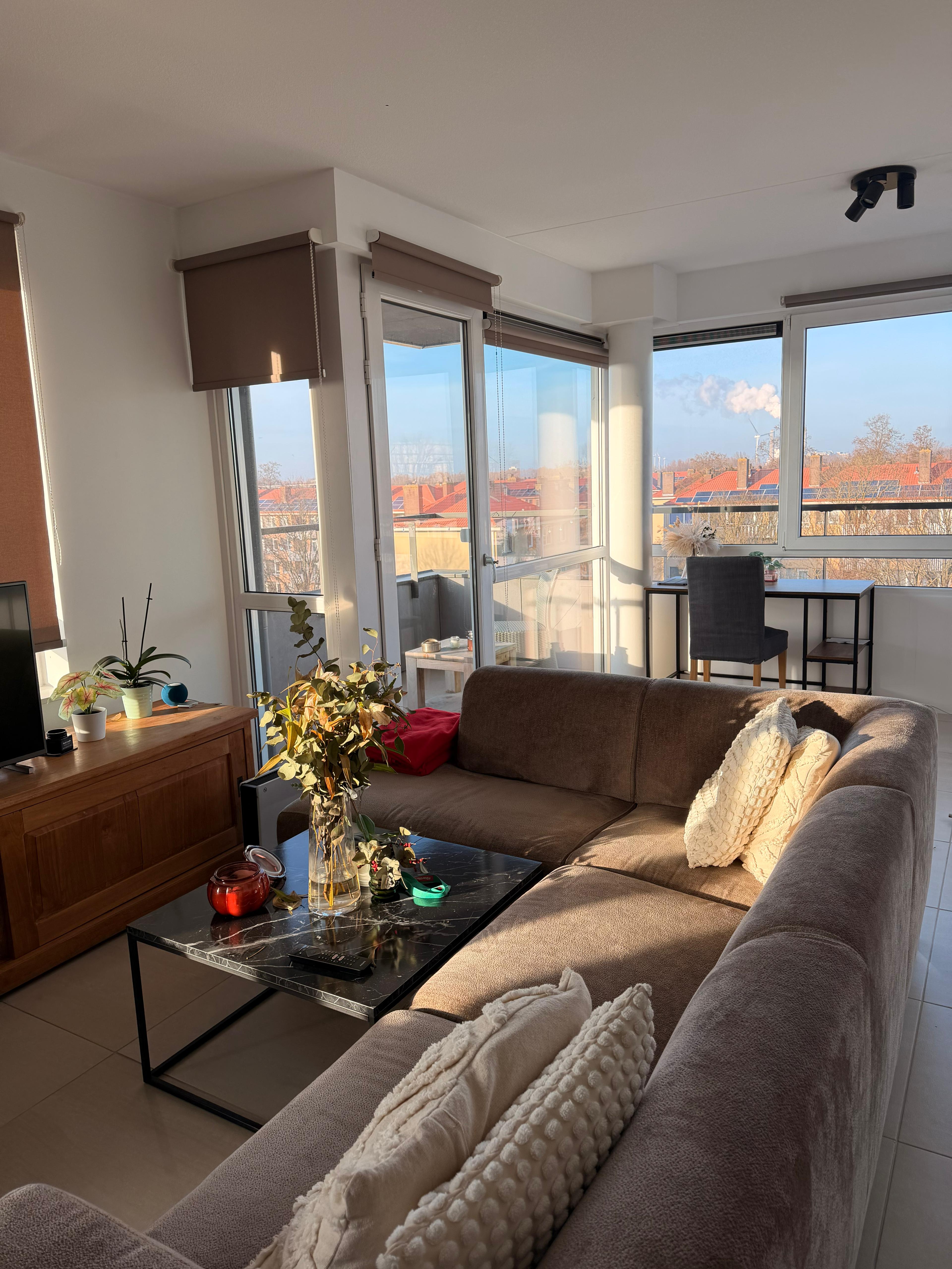 3 sleeping rooms, toilet separate from space bathroom, big kitchen and living room surrounding by big windows around the apartment next to the small canal..