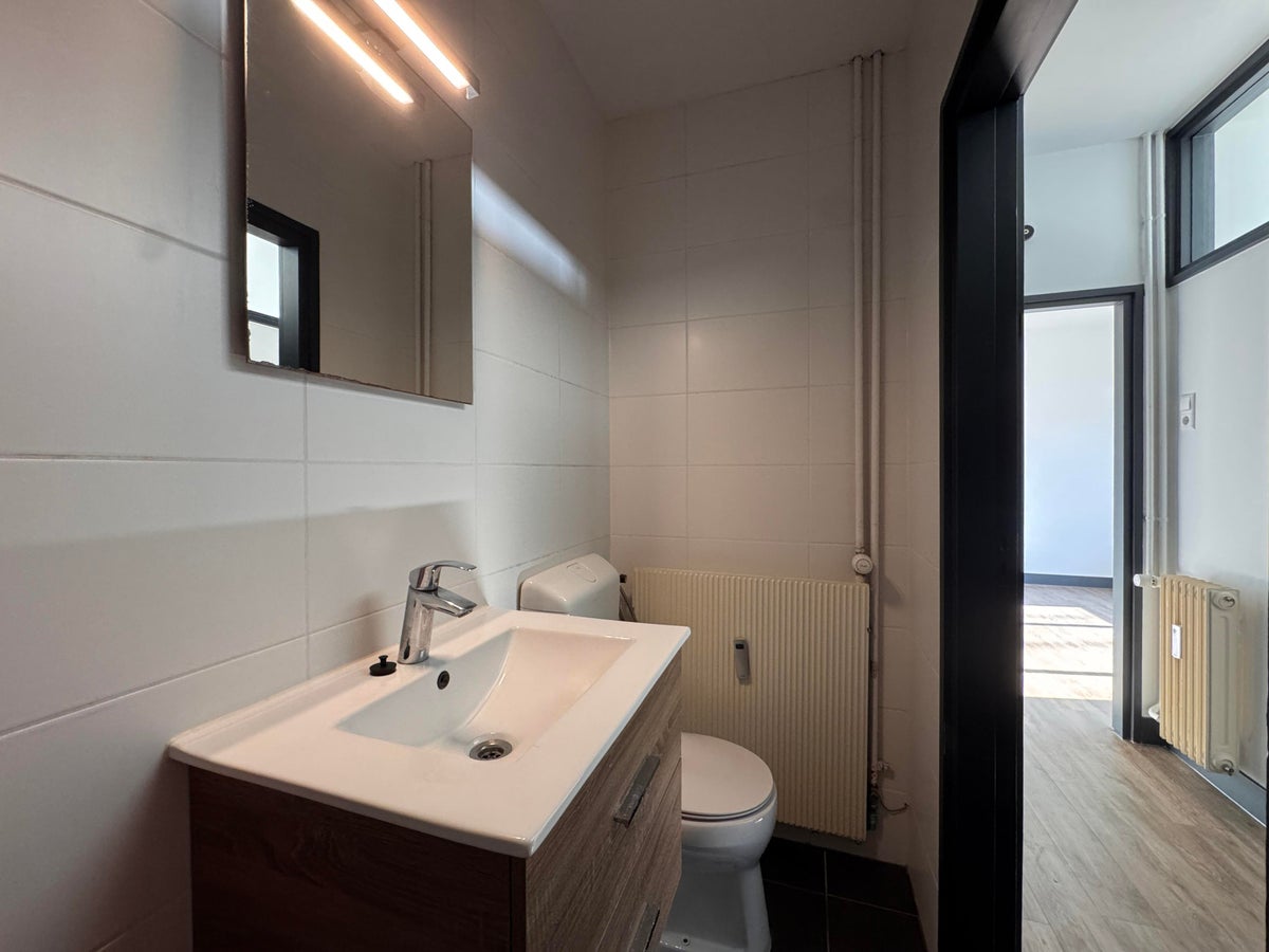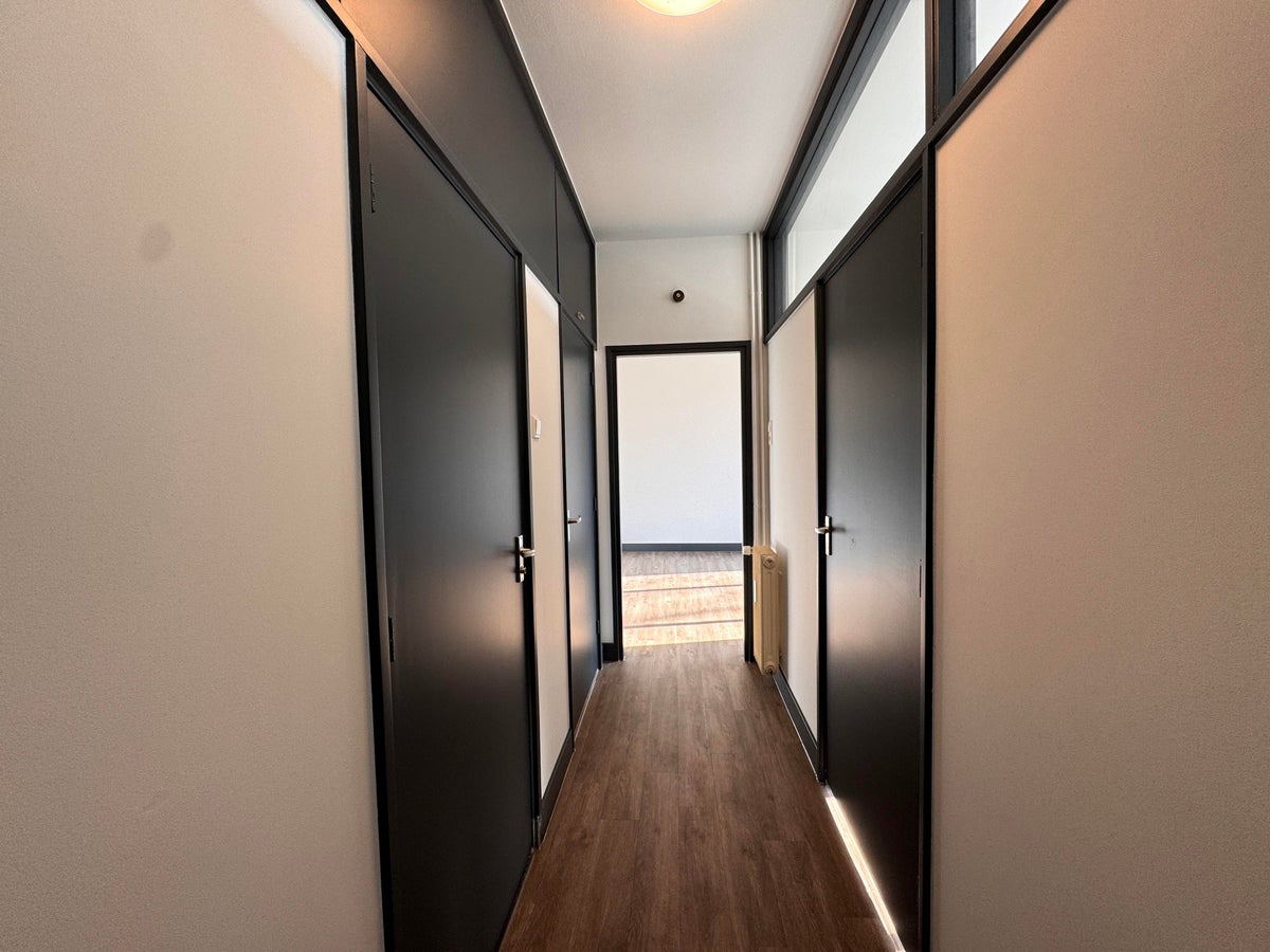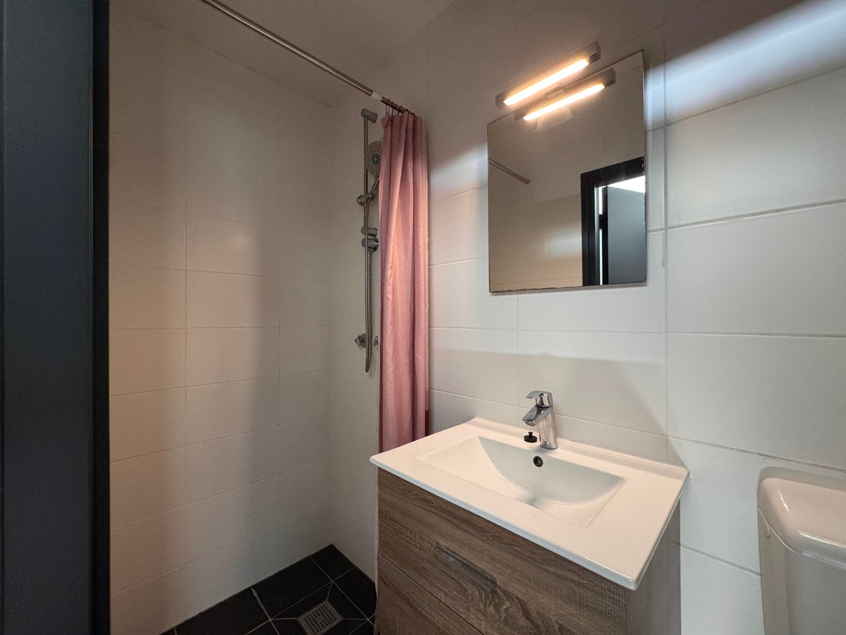 Vanuit de gang heb je toegang tot de woonkamer, de slaapkamer en badkamer. De badkamer heeft een douche, toilet en wastafelmeubel.
