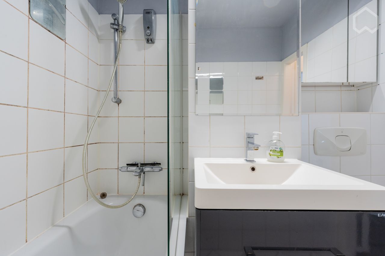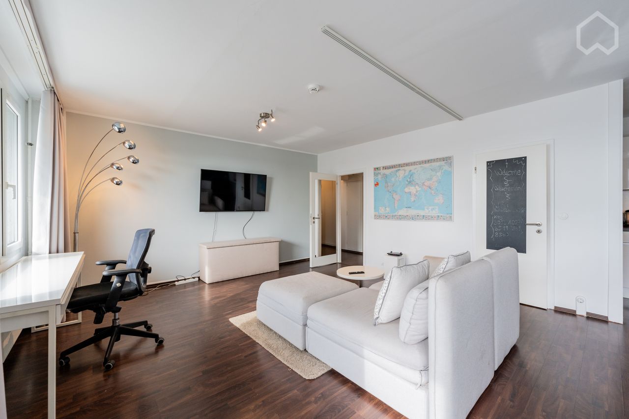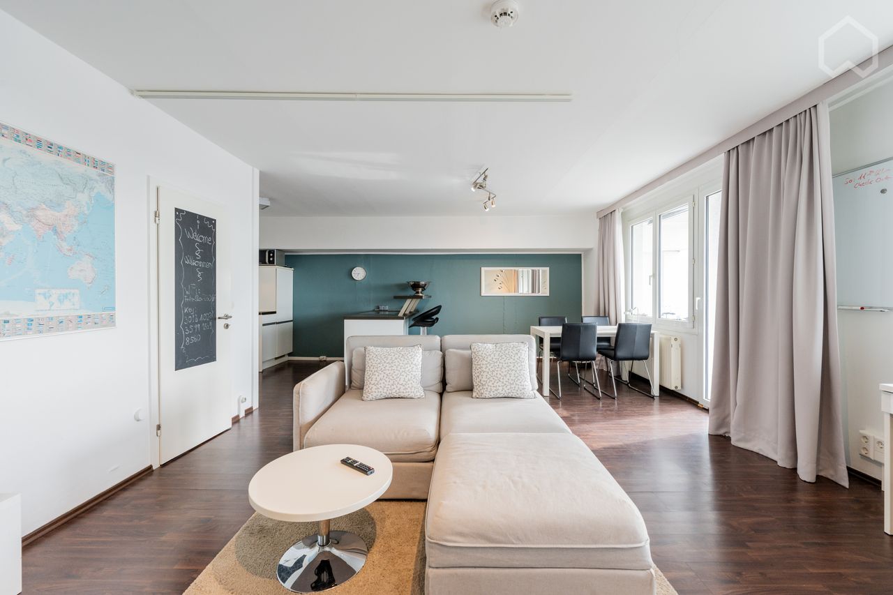 De woonkamer baadt in natuurlijk licht, dat doorstroomt naar een ruim balkon en zo het uitzicht over het appartement vergroot.