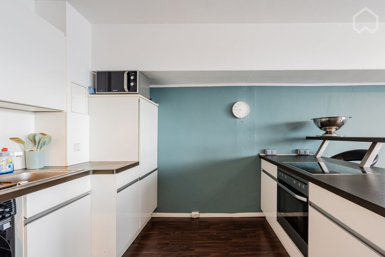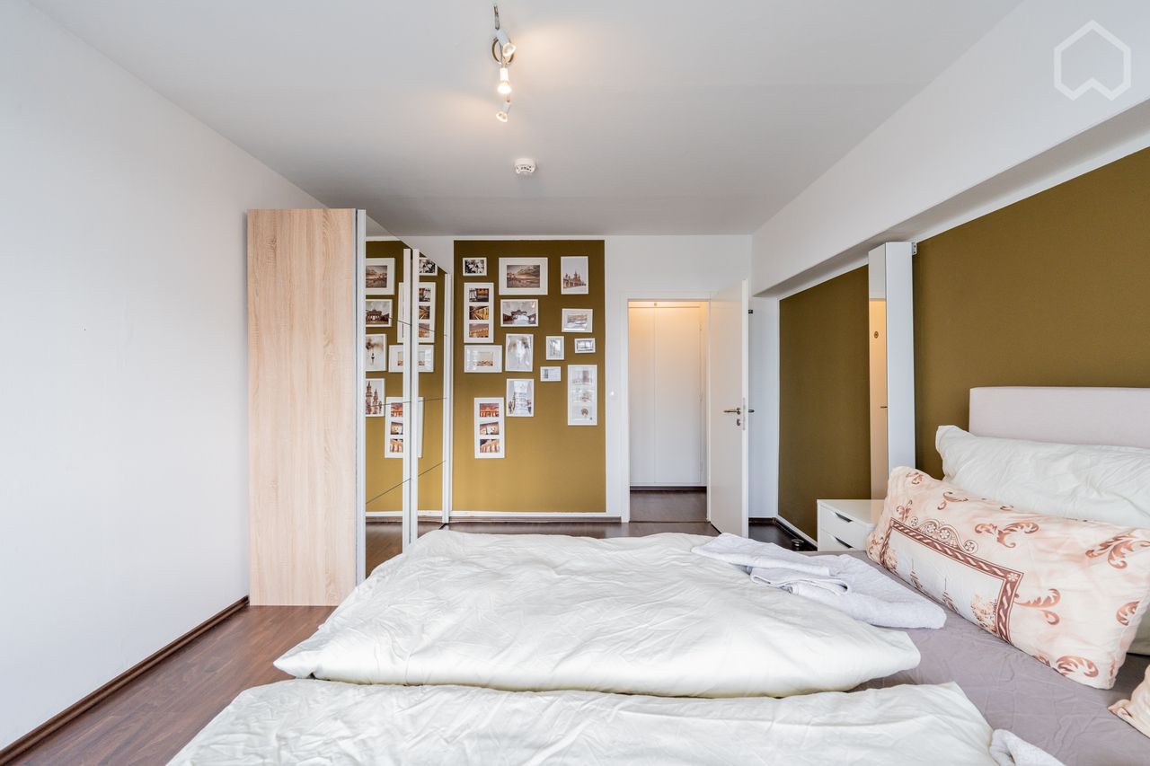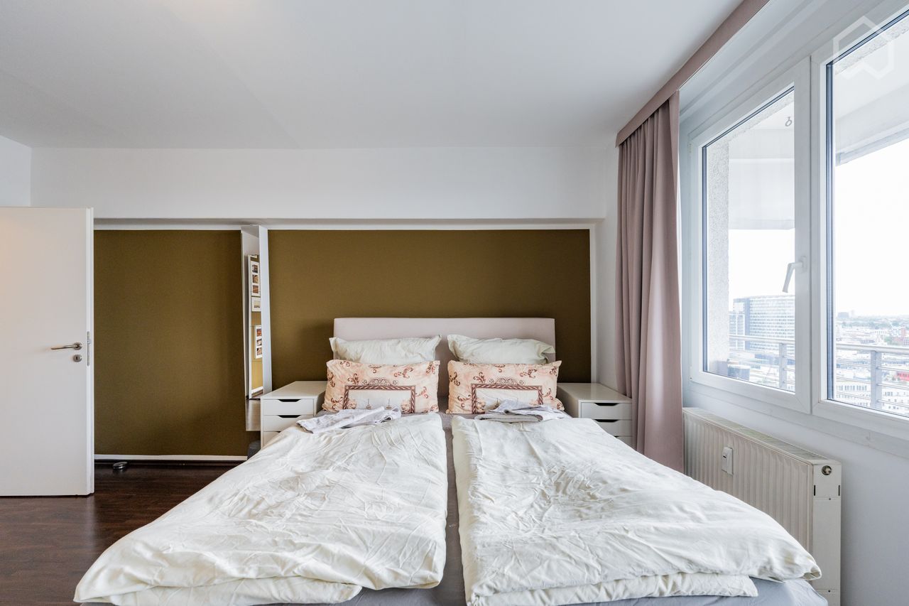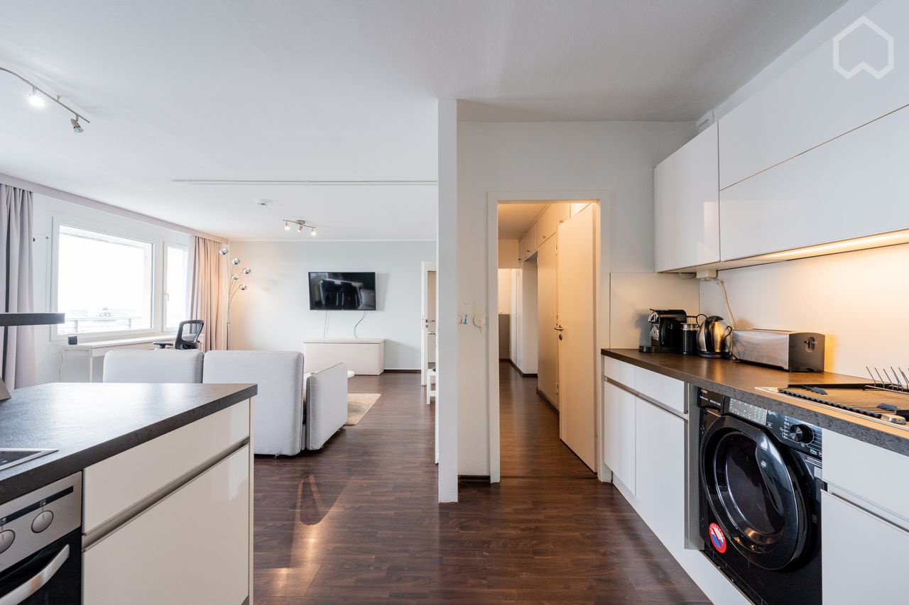 Het appartement belichaamt stedelijke elegantie met een ruimtelijk ontwerp, waarbij de slaapkamer naadloos overgaat in een grote woonkamer met een moderne open keuken.