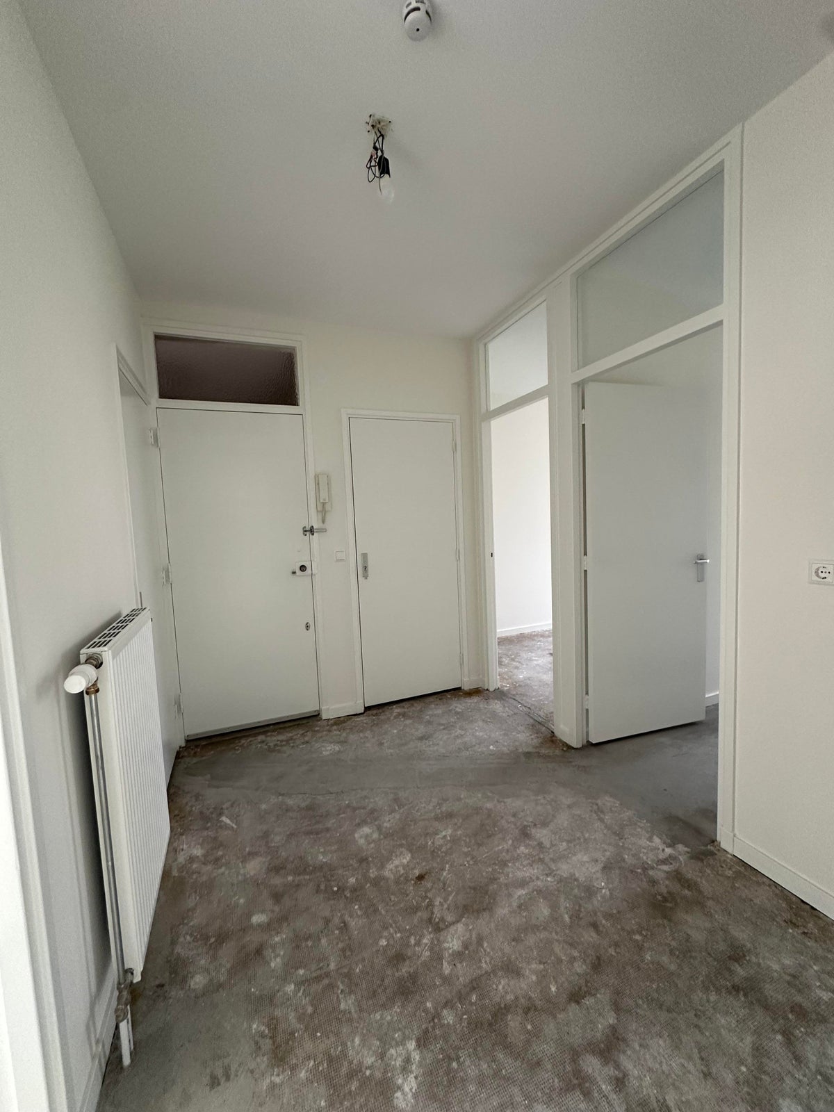 Hal met toegang tot de keuken en de badkamer, de ruime woonkamer, twee slaapkamers en het toilet.
