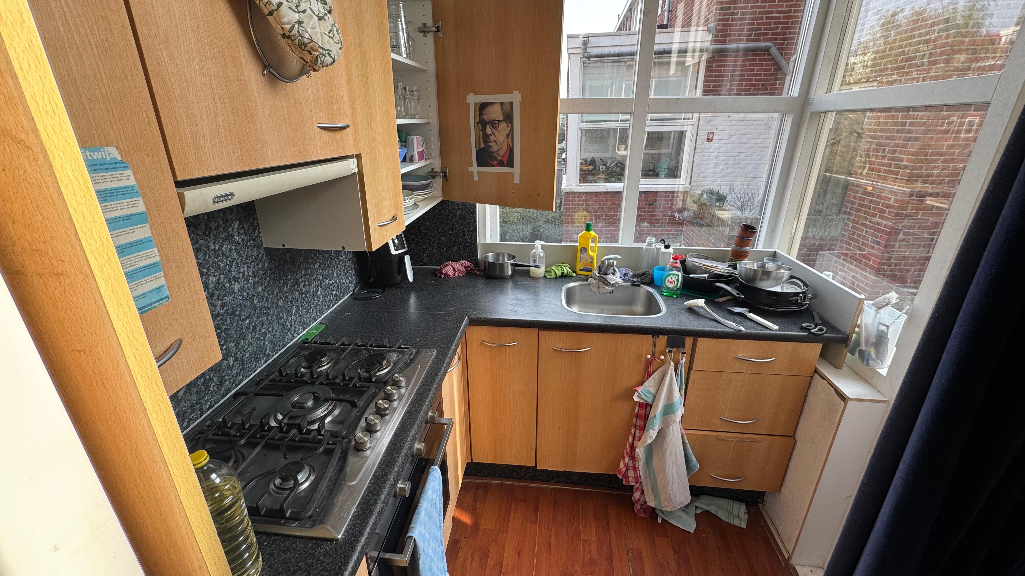 De kamer beschikt binnenkort over een eigen wasbakje, wat extra comfort biedt. Je deelt de ruime woonkamer, keuken, badkamer en het toilet met twee huisgenoten.