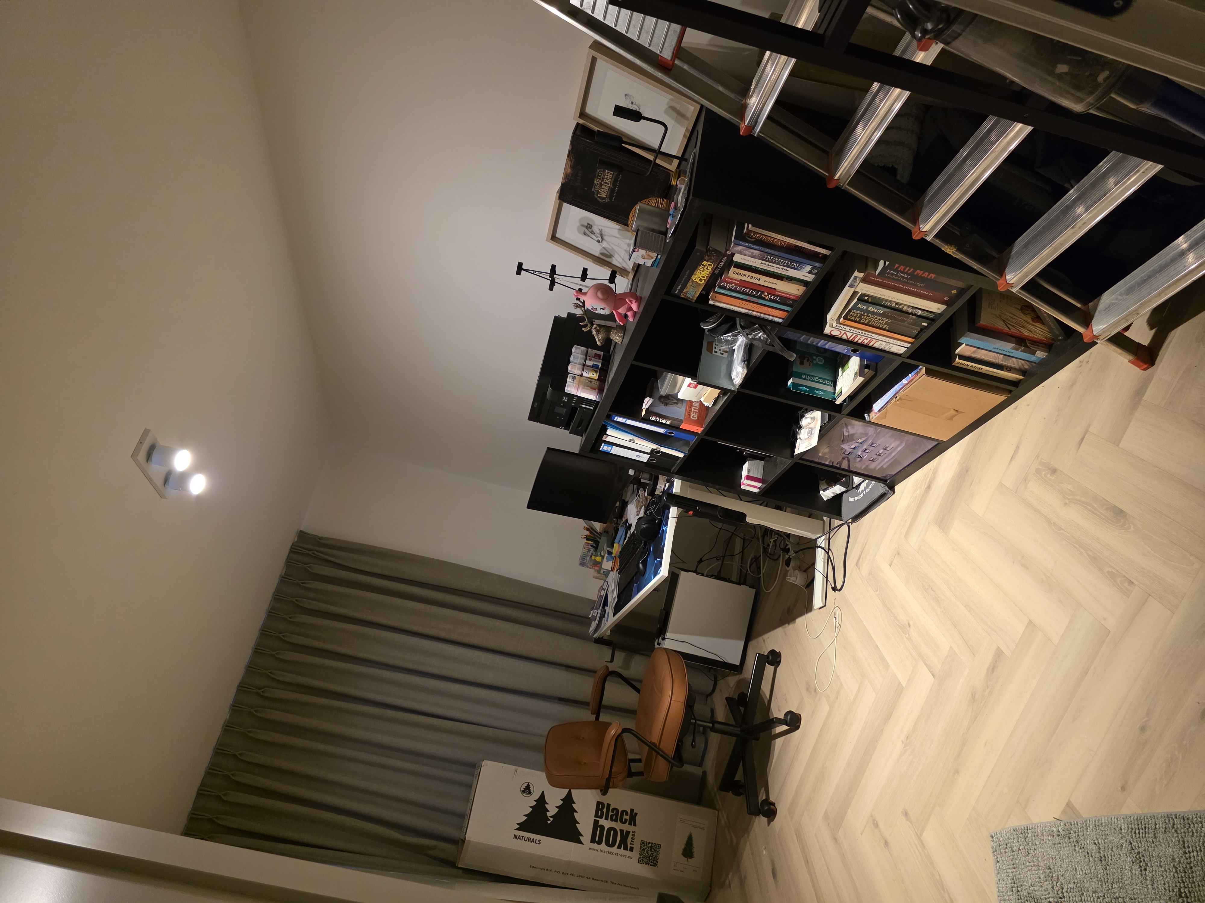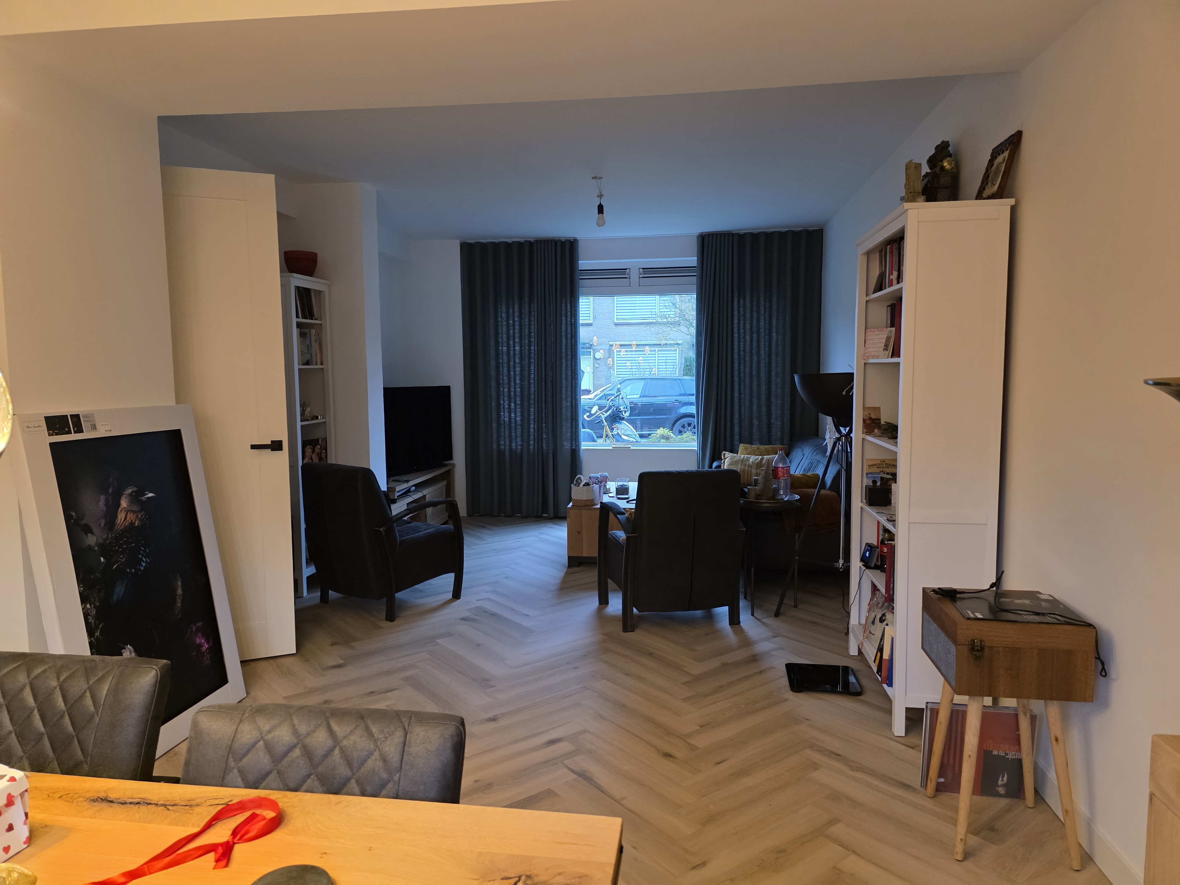 De bovenverdieping wordt bewoont door een werkende dame..