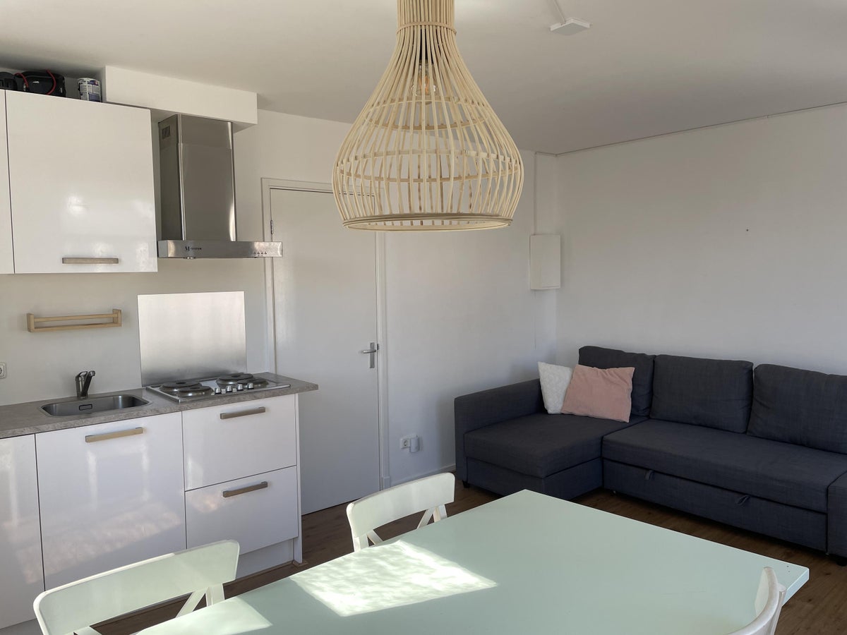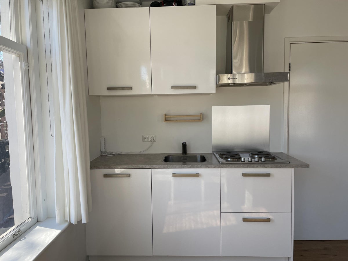 Via de keuken heb je toegang tot de slaapkamer, en via de slaapkamer heb je toegang tot de badkamer. De slaapkamer is groot genoeg voor een tweepersoonsbed en kledingkast.