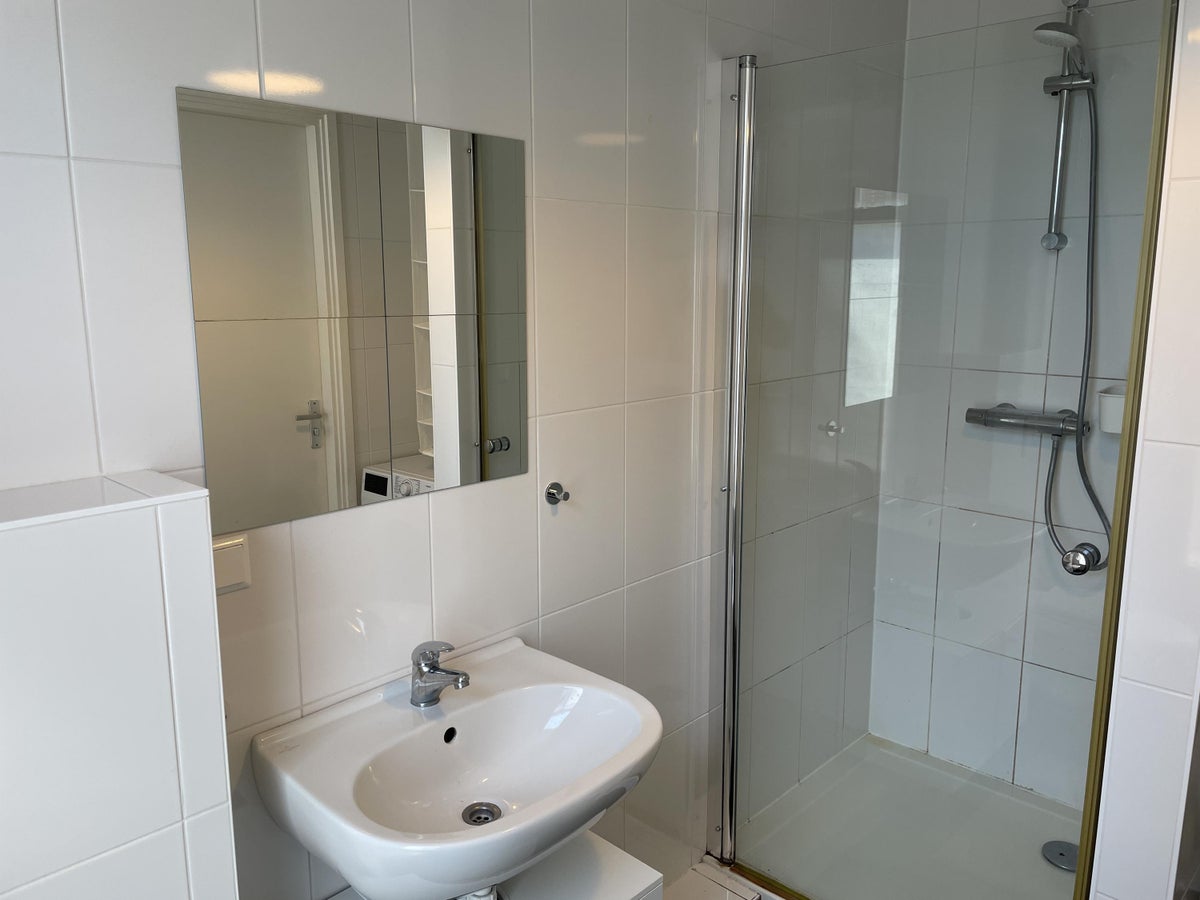 De badkamer is voorzien van een wastafel, wasmachine aansluiting, zwevende toilet en douche.