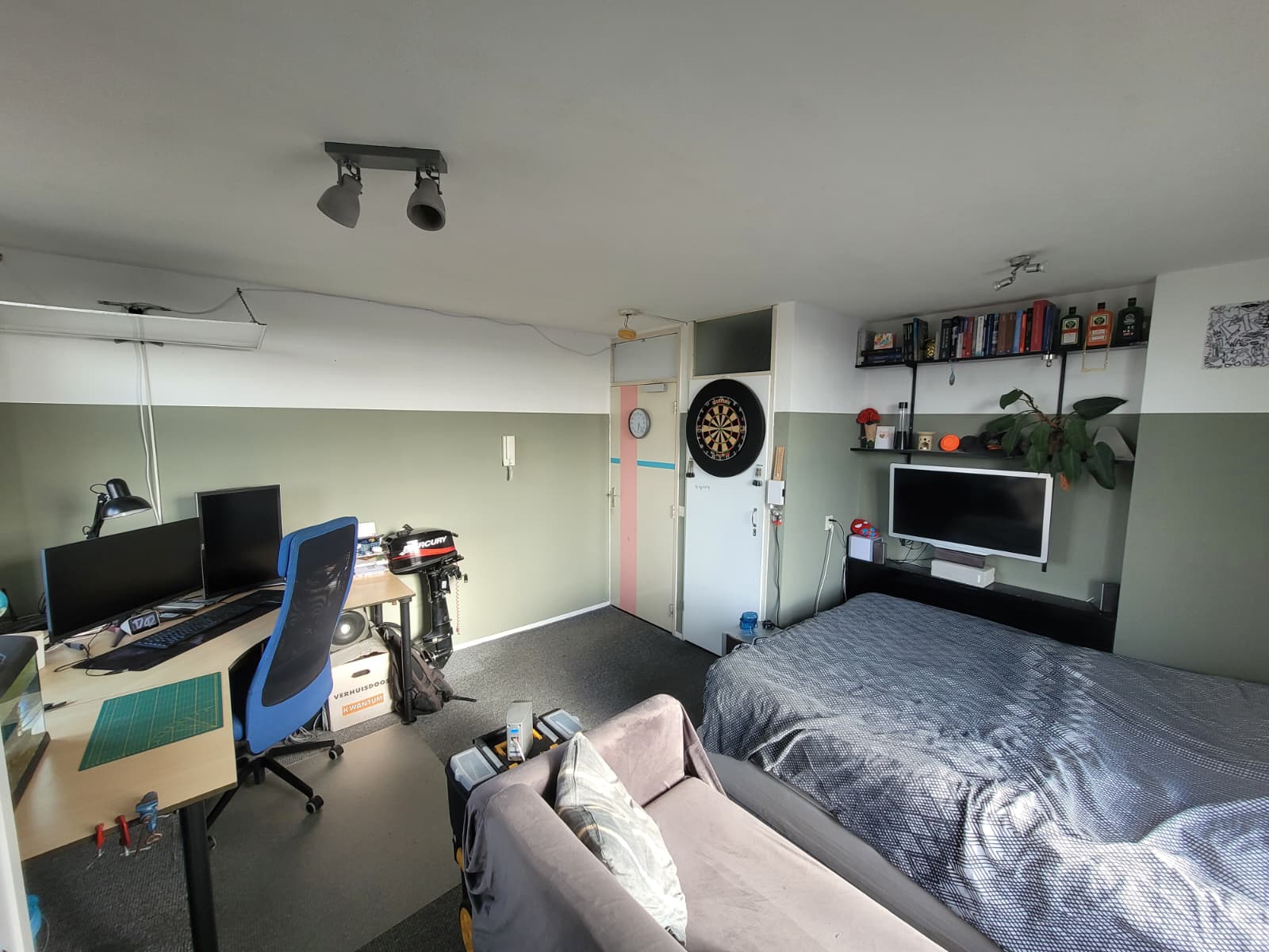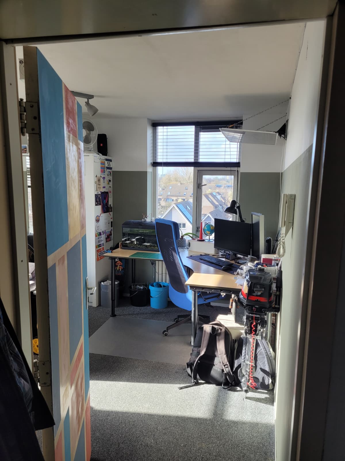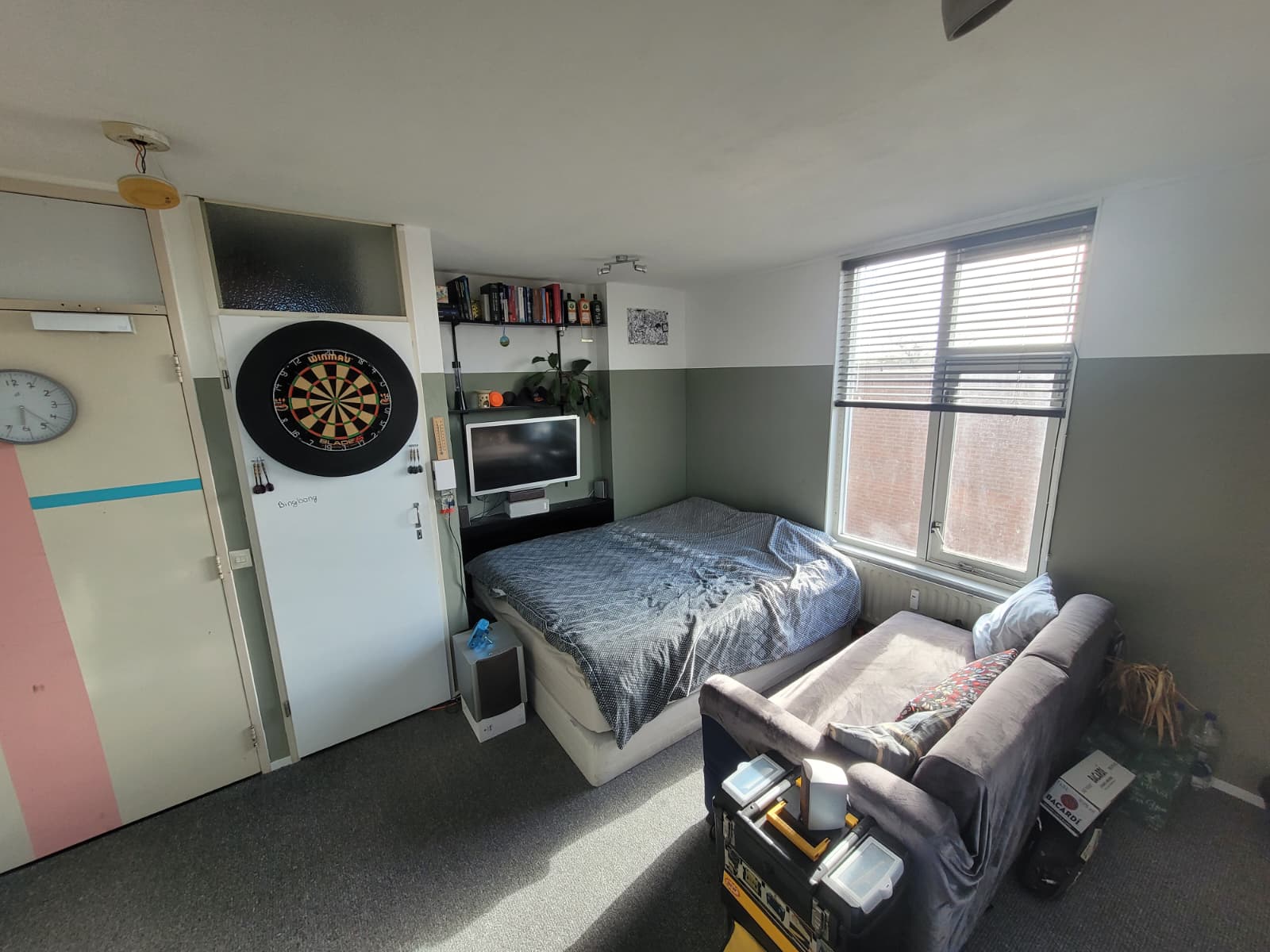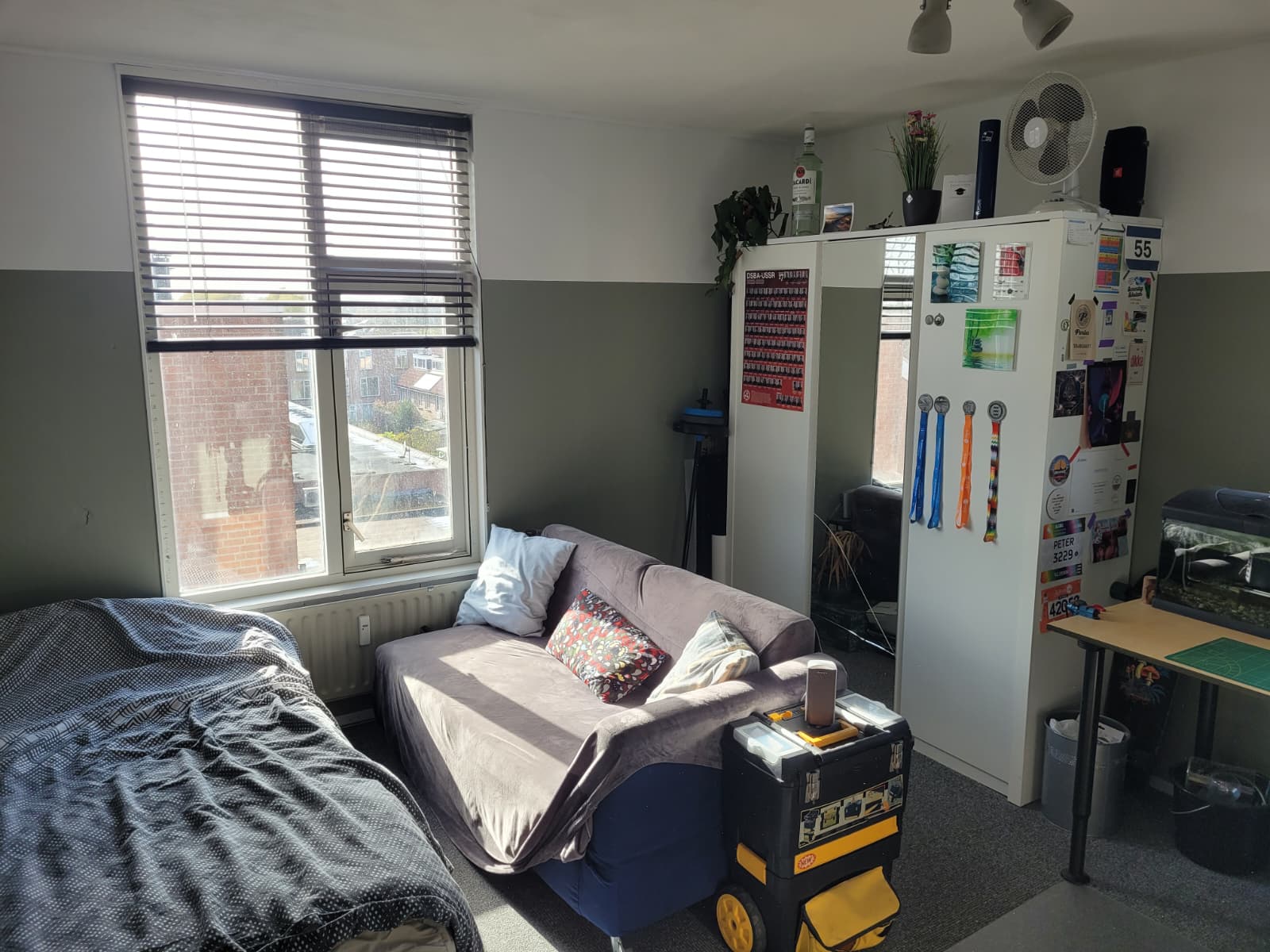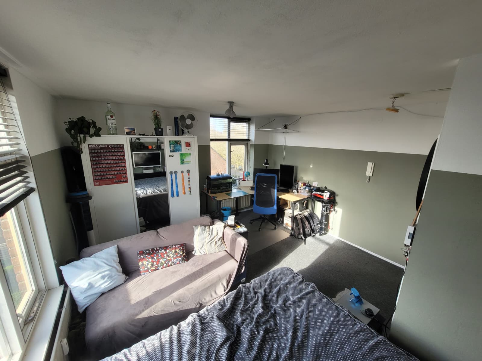 De kamer is 17 vierkante meter groot en er is lekker veel daglicht. We hebben twee WC's en twee douches, dus je hoeft nooit lang te wachten.