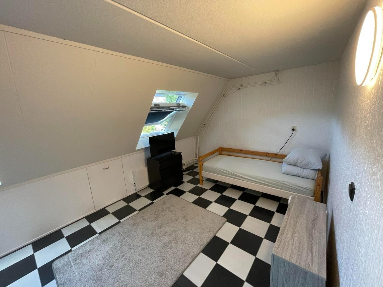 Furnished as can be seen on the photos + a desk with a chair. Suitable for a quiet and a clean person.