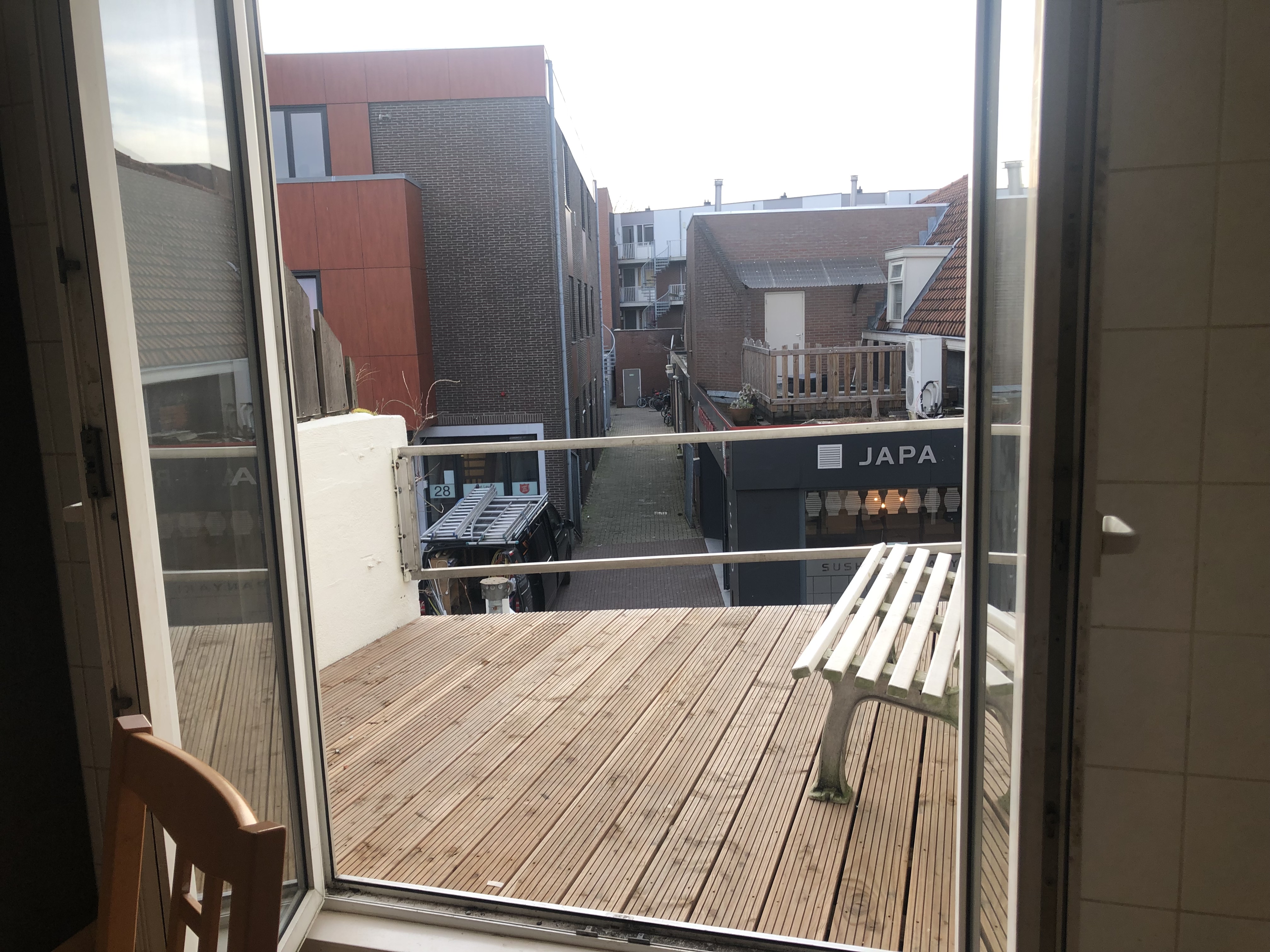 De kamer kijkt uit op de winkelstraat van Ede-centrum.