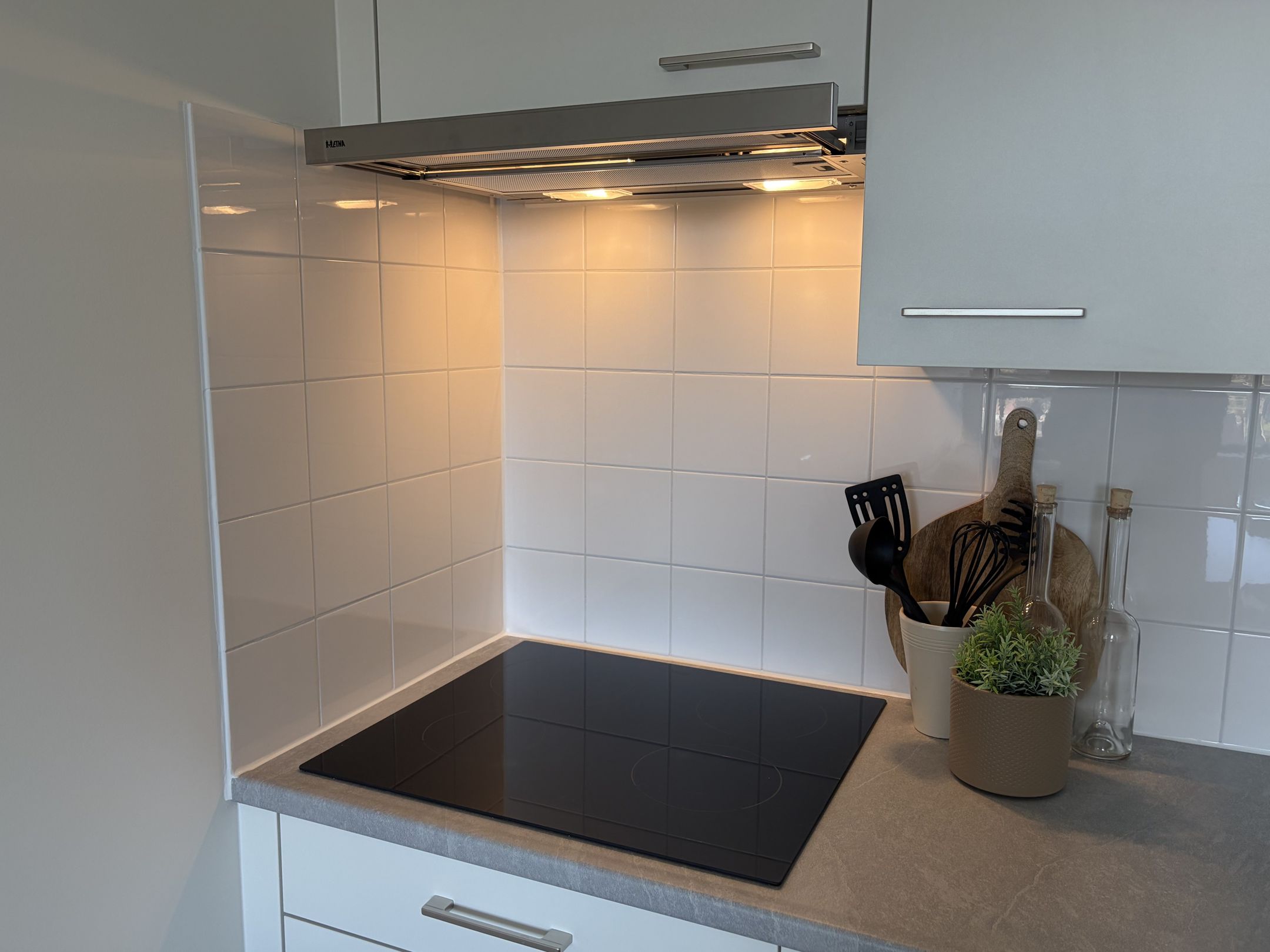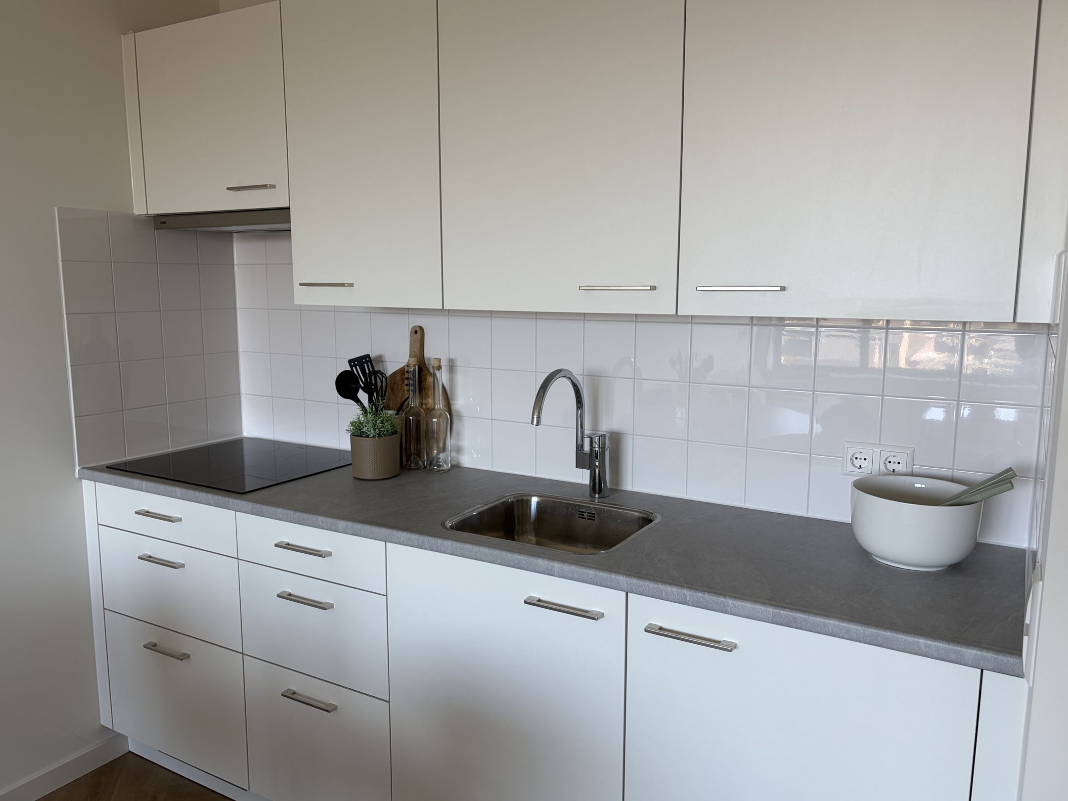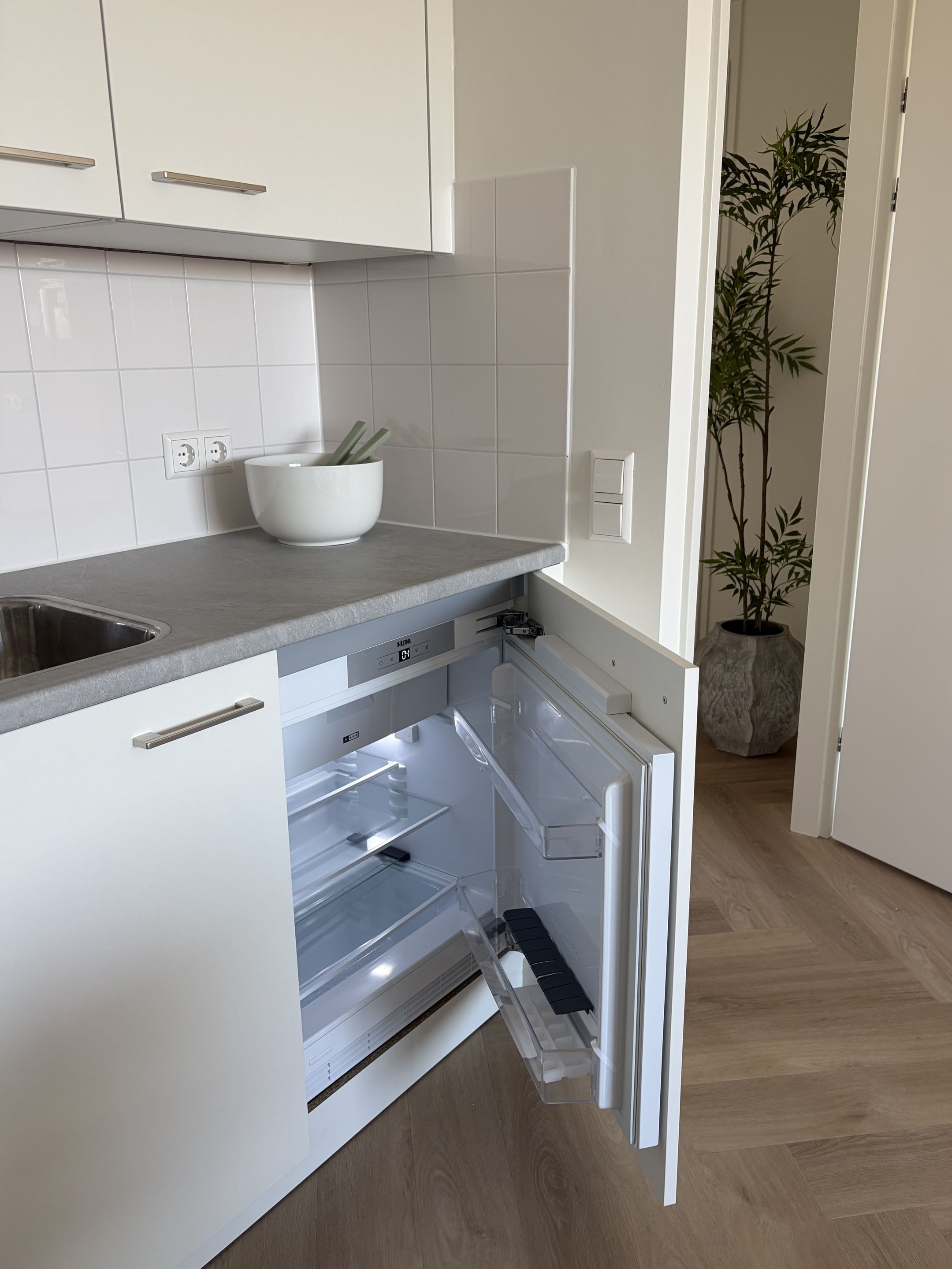 Entree / hal, woonkamer met open keuken voorzien van inductiekookplaat, koelkast en afzuigkap, één slaapkamer, badkamer met douche, thermostaatkraan, wastafel en zwevend toilet, technische ruimte met warmtepomp, elektrische boiler en wasmachineaansluiting.