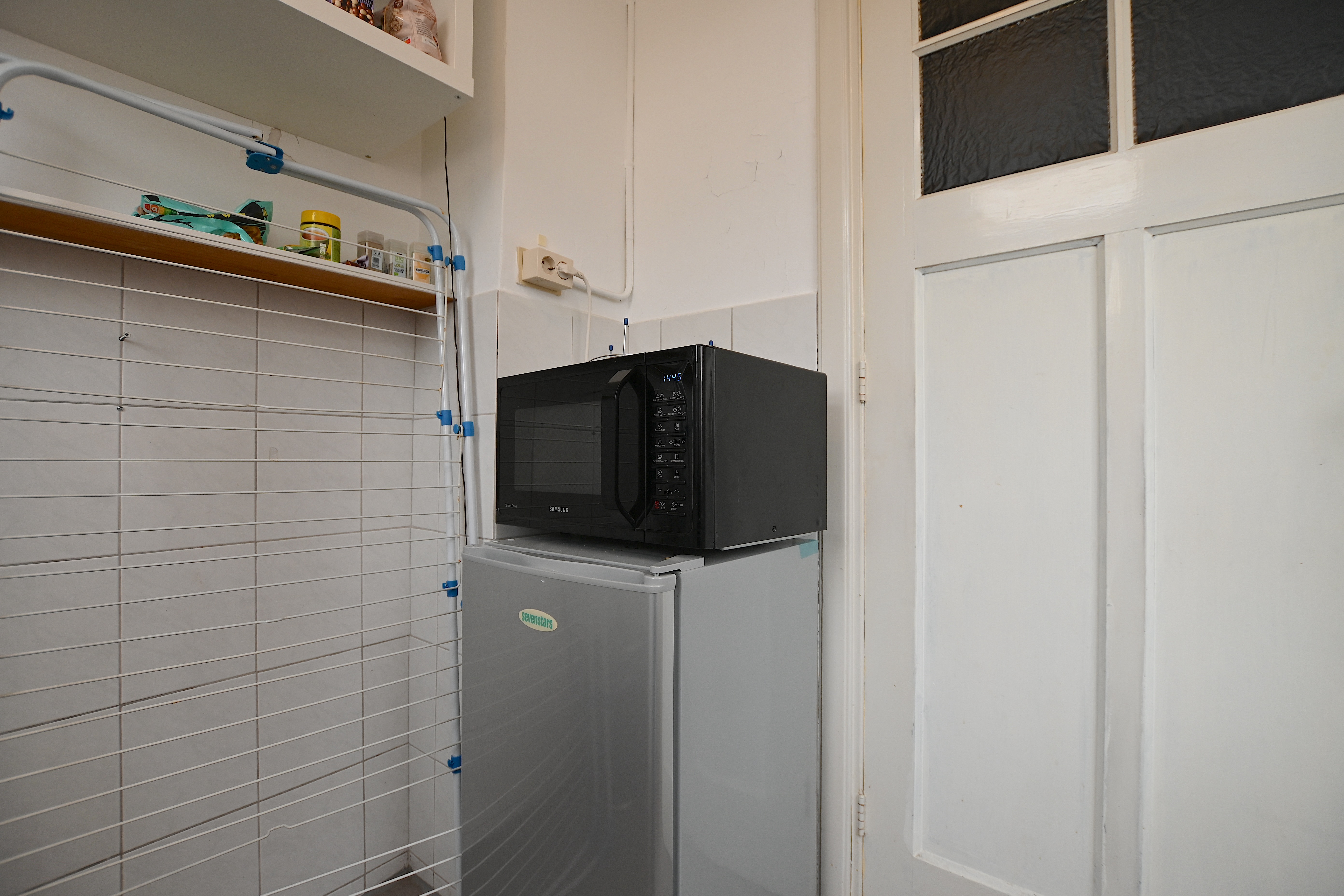 De kamer heeft een eigen keuken, voorzien van een gaskookplaat met vier pitten, een wasbak en kastruimte voor keukenspullen.